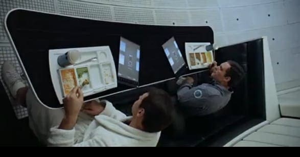 Filmul-cult regizat de Stanley Kubrick – bazat pe cartea omonimă scrisă de Arthur C. Clarke – prezintă o scenă în care doi astronauţi de pe naveta spaţială Discovery One stau la masă şi navighează, în timp ce mânâncă, prin conţinutul de pe două tablete.