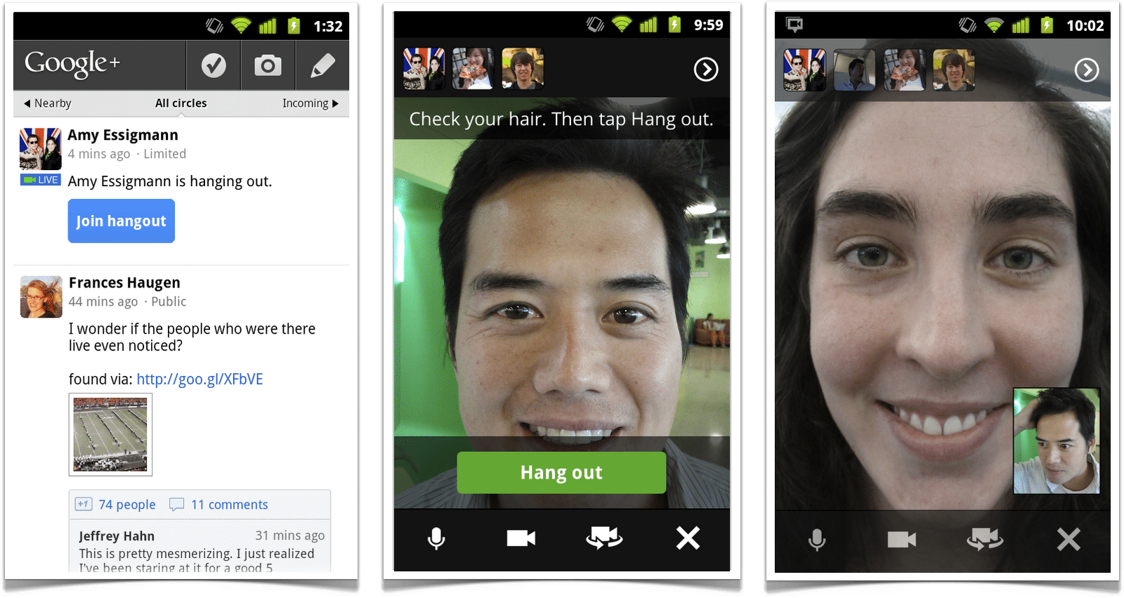 Hangouts pe telefon – Hangouts trebuie să ţina pasul cu modul în care socializam în lumea reală, aşa că astăzi Google lansează această opţiune pe dispozitivul pe care îl avem mereu cu noi: telefonul mobil. Hangouts acceptă în prezent dispozitive cu sistem de operare Android 2.3+ cu cameră frontală (iOS în curând). Aplicaţia poate fi descărcată de azi din Android Market, astfel încat să poţi începe să te vezi cu prieteni în orice moment, de aproape oriunde.