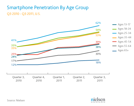 Conform unui raport întocmit în cel de-al treilea trimestu al anului de către firma de specialitate Nielsen Research, americanii sub vârsta de 44 de ani preferă un smartphone. În plus, raportul relevă o atracţie mai mare spre smartphone-uri a utilizatorilor telefoanelor mobile.