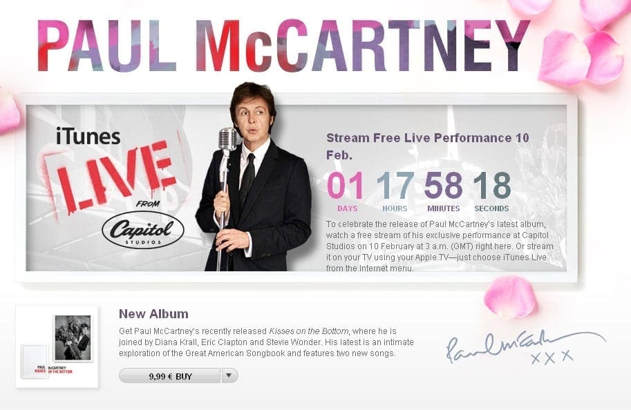 Fostul chitarist The Beatles va susţine un concert vineri la Capitol Studios ce va fi transmis în direct de Apple prin programul iTunes şi serviciul Apple TV. Concertul va avea loc pentru a promova albumul Kisses on The Bottom, cel mai nou material audio semnat Paul McCartney, care e disponibil acum pe iTunes.