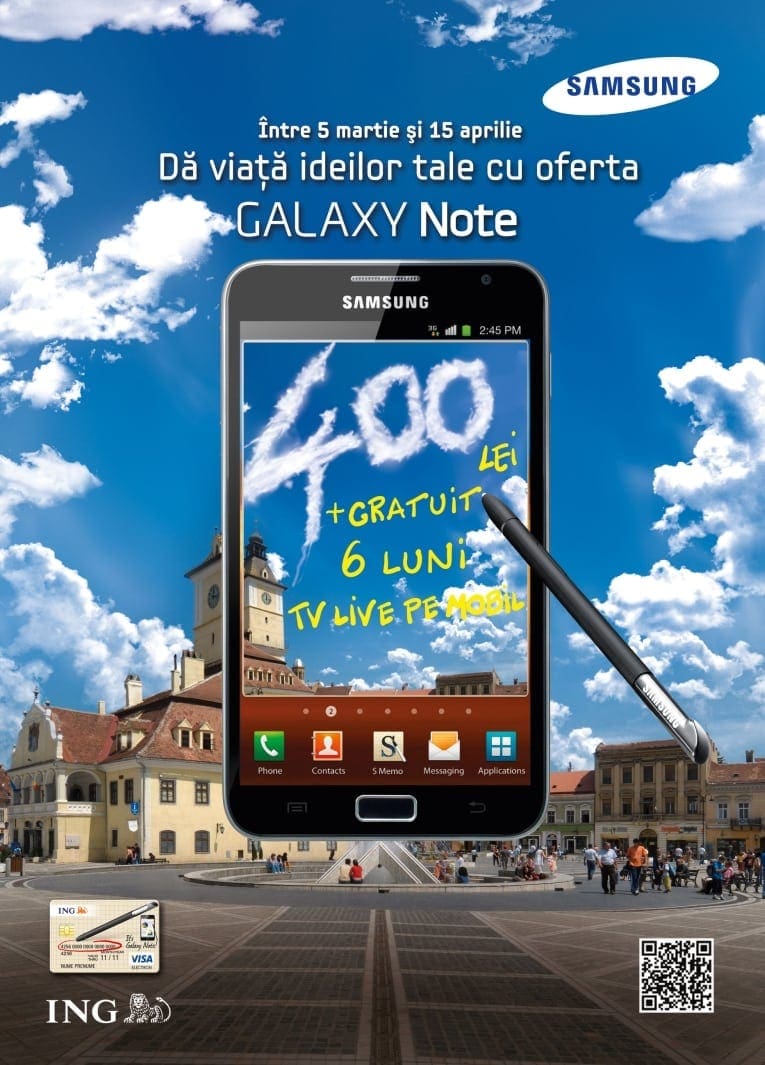 Cei care îşi cumpără un Samsung Galaxy Note între 5 martie şi 15 aprilie 2012 vor primi 400 de lei pe un card ING personalizat, precum şi 6 luni de TV live, direct de pe smartphone, prin intermediul aplicaţiei Seenow.
