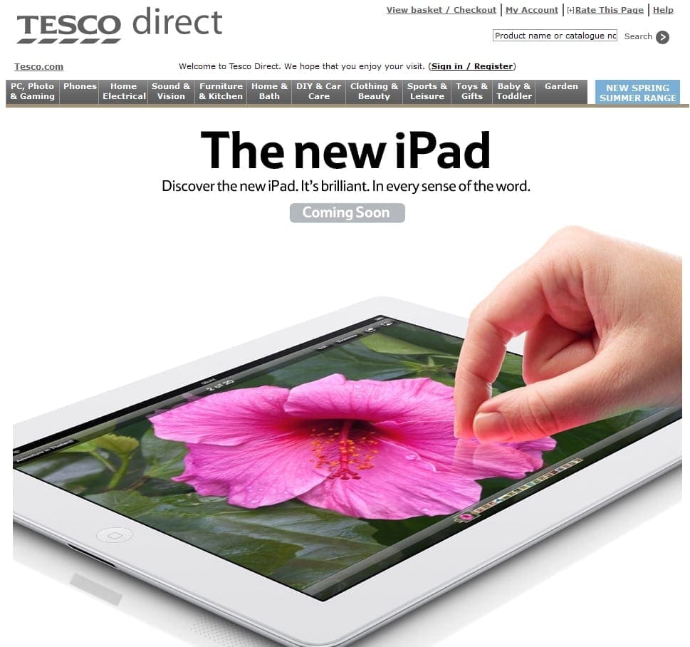 Clienţii care au accesat site-ul celor de la Tesco, unul dintre cele mai mari lanţuri de magazine din Marea Britanie, au fost şocaţi să afle că preţul pentru versiunea de 64GB a noului iPad era de doar 49.99 de lire. Vestea s-a răspândit rapid pe reţelele de socializare, iar eroarea a dus la un număr mare de comenzi care a reuşit chiar şi să blocheze temporar site-ul.