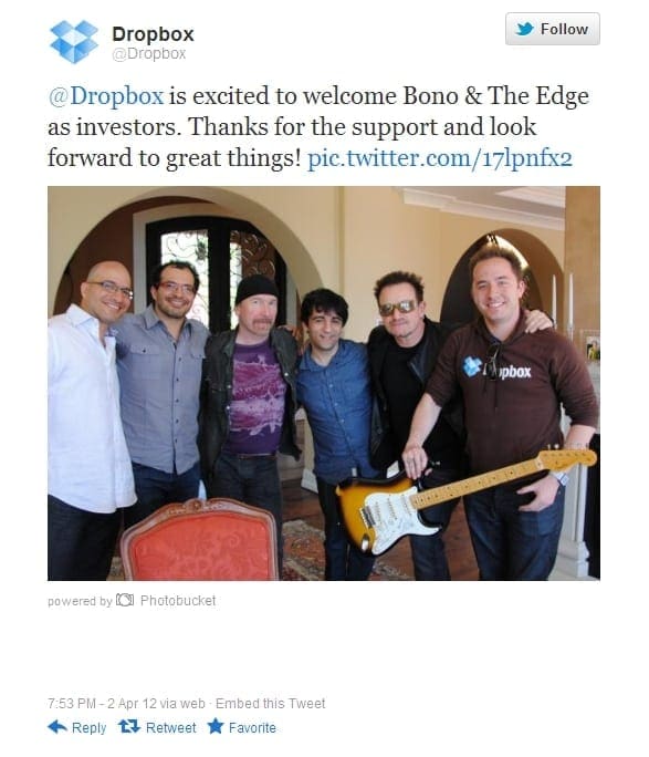 Reprezentanţii companiei Dropbox Inc., responsabilă pentru celebra aplicaţie de file-sharing, a anunţat doi noi investitori: cântăreţul Bono şi chitaristul Edge de la formaţia U2. Anunţul a fost făcut aseară printr-un tweet apărut pe contul oficial Dropbox. Cei doi artişti au apărut într-o poză alături de cei doi fondatori Drew Houston şi Arash Fredowsi.