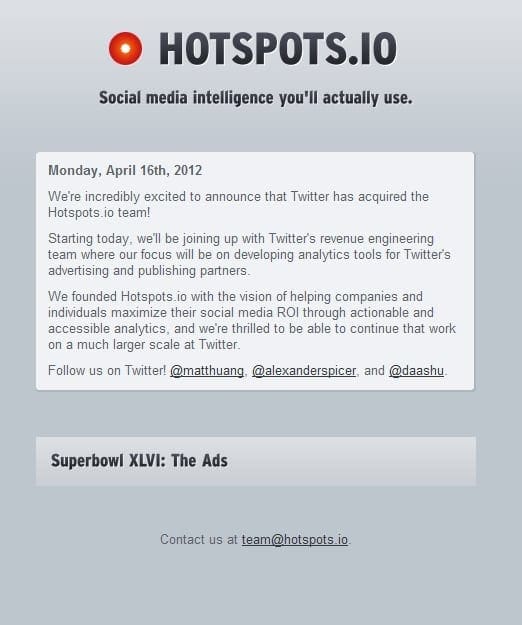Hotspots.io e un serviciu ce oferă o analiză a mesajelor de pe Twitter pentru a afla impactul unor campanii de publicitate în rândul utilizatorilor. Spre exemplu, Hotspots.io a realizat o statistică a celor mai discutate spot-uri publicitare ce au fost transmise în timpul Superbowl-ului, cel mai mare eveniment sportiv al anului pentru americani. Astfel, compania poate estima dacă spot-urile publicitare realizat de companii precum H&M, Coca-Cola sau Doritos au stârnit reacţii şi mesaje pe Twitter.