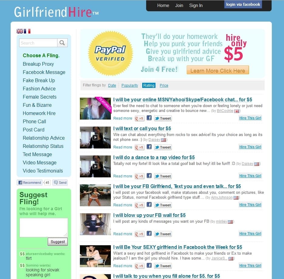 Site-ul GirlfriendHire.com oferă un serviciu cel puţin ciudat pentru posesorii unui cont de Facebook. Pentru suma relativ modestă de 5 dolari, utilizatorul poate să-şi achiziţioneze o „prietenă” pe reţeaua de socializare care să îi posteze mesaje de drag pe Timeline sau să îi comenteze la poze.