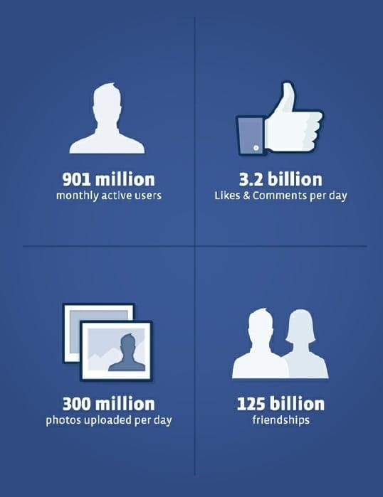 Actualmente, Facebook găzduieşte un număr total de utilizatori activi lunar de 901 milioane, o cifră extrem de impresionantă în comparaţie cu alte reţele de socializare. Aceşti utilizatori dau 3.2 miliarde de like-uri şi comentarii pe zi. În plus, reţeaua de socializare fondată de Mark Zuckerberg totalizează 125 miliarde de prietenii.