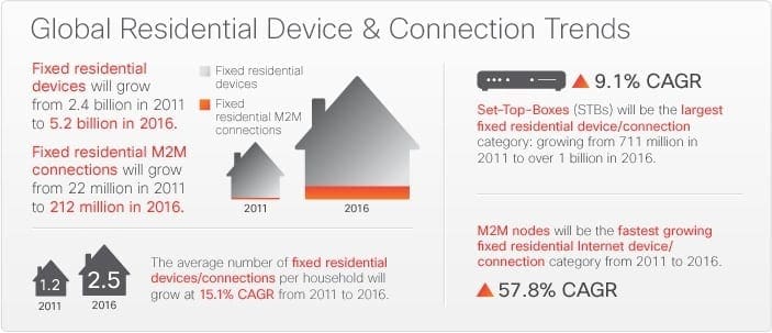 Conform studiului anual Cisco Visual Networking Index Forecast, până în 2016 vor exista aproape 18,9 miliarde de conexiuni în reţea, datorită exploziei pieţelor de tablete, smartphone-uri şi alte dispozitive electronice.