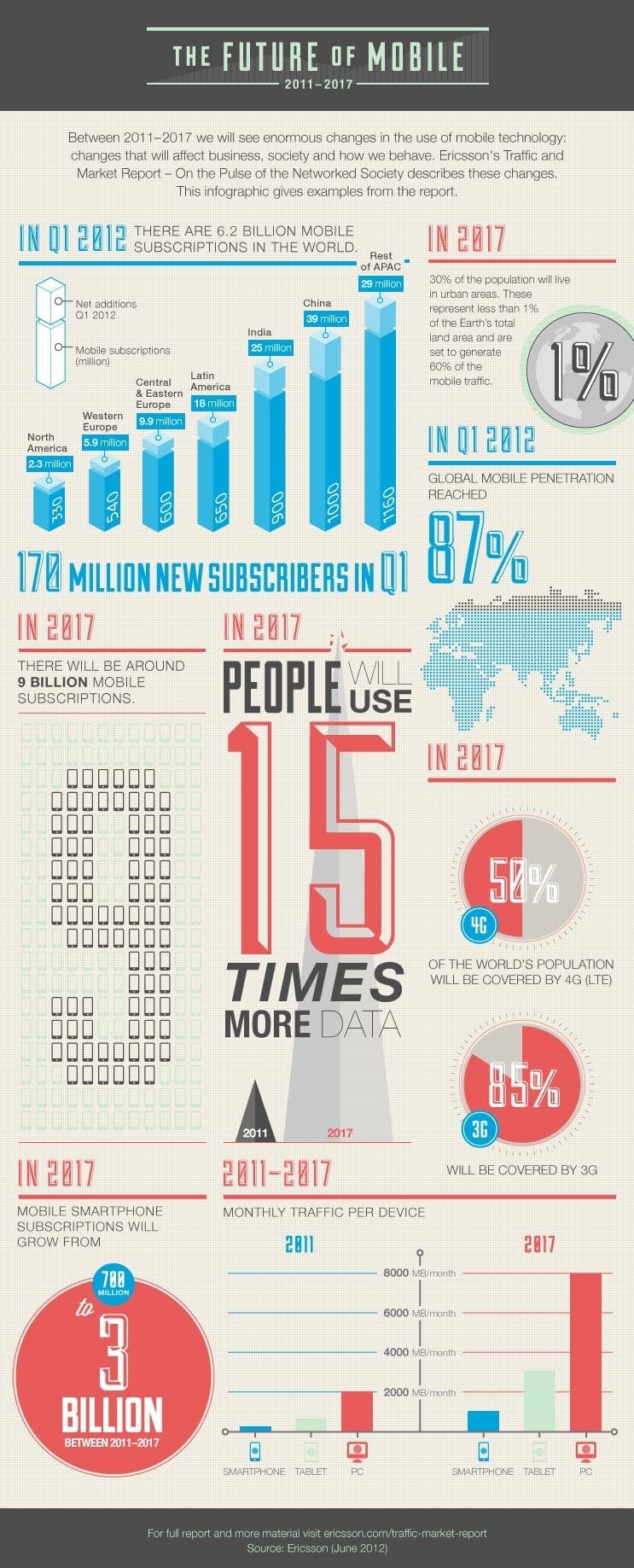 Conform celui de-al doilea raport Ericsson despre traficul mondial de date şi piaţa de telefonie mobilă, până în 2017, 85% din populaţia lumii va beneficia de acoperire 3G, în timp ce numărul abonaţilor de telefonie mobilă va creşte de la cei 6 miliarde înregistraţi la finalul anului 2011 până la aproximativ 9 miliarde de abonaţi.