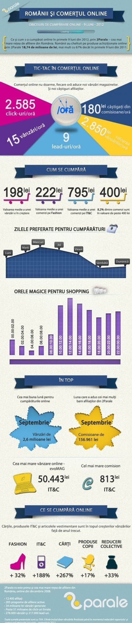 Conform unui nou raport întocmit de 2Parale pe parcursul a nouă luni din anul curent, românii au facut cumpărături în mediul on-line de aproximativ 3.000 RON pe oră. Mai mult, magazinele online au înregistrat în această perioadă o creştere de 67% faţă de aceeaşi perioadă din 2011, vânzările ajungând la peste 18,7 milioane de lei.