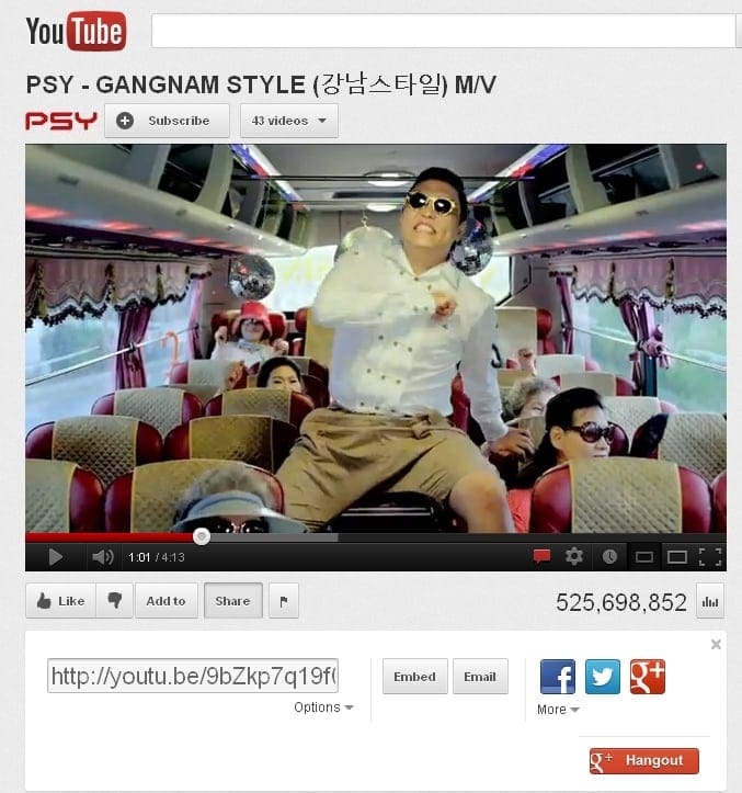 Conform ChannelMeter, un site ce se ocupă cu statistici legate de conţinutul postat pe Youtube, clipul piesei Gangnam Style va deveni cel mai vizionat din istoria platformei de video-sharing. Piesa semnată de PSY va trece de numărul de 1 miliard de vizualizări înainte de Crăciun.