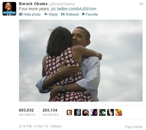 Mesajul „Încă patru ani”, acompaniat de o poză cu Barack Obama în care îşi îmbrăţişează soţia, a fost retrimis pe Twitter de peste 600.000 de ori, un număr care a spart recordul anterior de 223.399, deţinut de cântăreţul pop Justin Bieber.