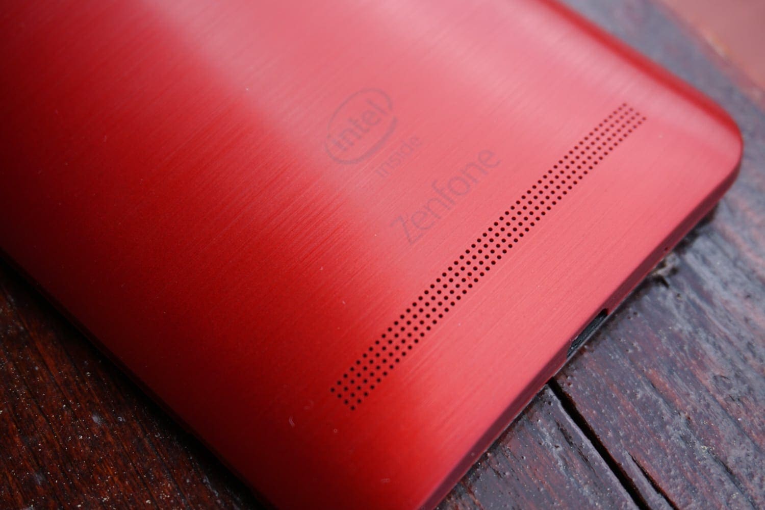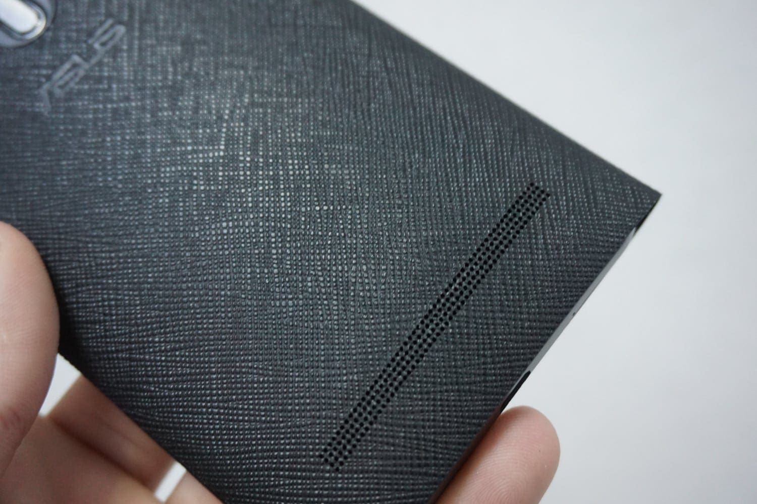 Spatele lucește ușor în lumină datorită unui strat metalic aplicat peste policarbonat. Aici se obser­vă blițul, camera, butoanele pen­tru volum, elementele de branding Asus, Intel și numele telefonului, iar în zona inferioară o incintă acustică cu perforații fine.