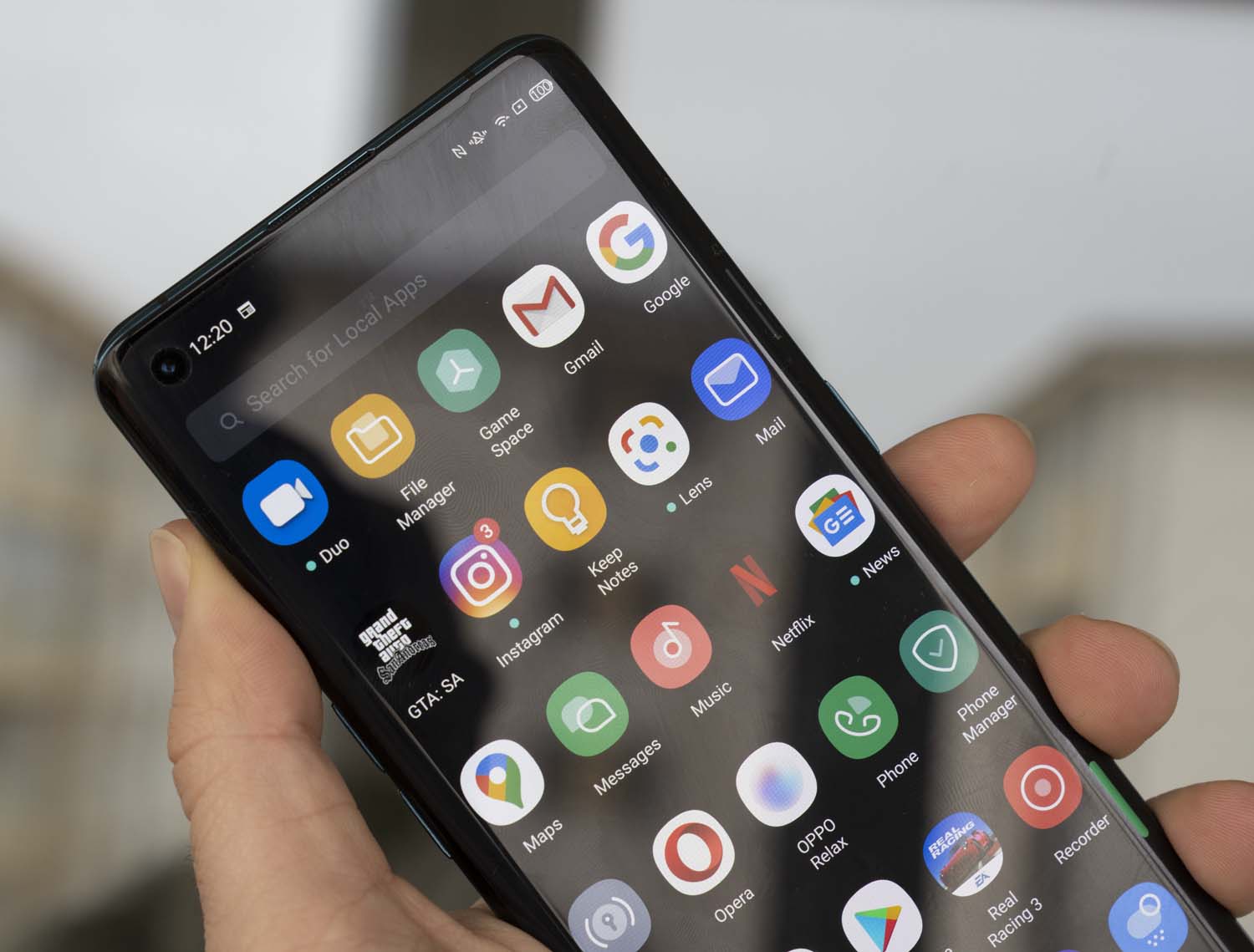 La nivel de construcție, OPPO a realizat un model de top, cu un cadru metalic și acoperit de sticlă pe față și spate. La mine a sosit varianta denumită Ocean, ceea ce ar trebui să fie un albastru ocean, dar mie mi se pare că tinde mai mult spre un verde smarald cu un pattern fin care asigură un grip mai bun. Lipsește jack-ul pentru căști, ceea ce plasează producătorul printre propagandiștii ideii de căști wireless. Pe dreapta avem butoanele fizice pentru volum și Power, iar la bază găsim grila pentru speaker, portul pentru încărcare și slotul pentru carduri nano-SIM, în timp ce în partea de sus se află poziționat al doilea speaker. Să nu uităm nici de senzorul de amprentă, integrat direct în ecran și care funcționează foarte rapid.