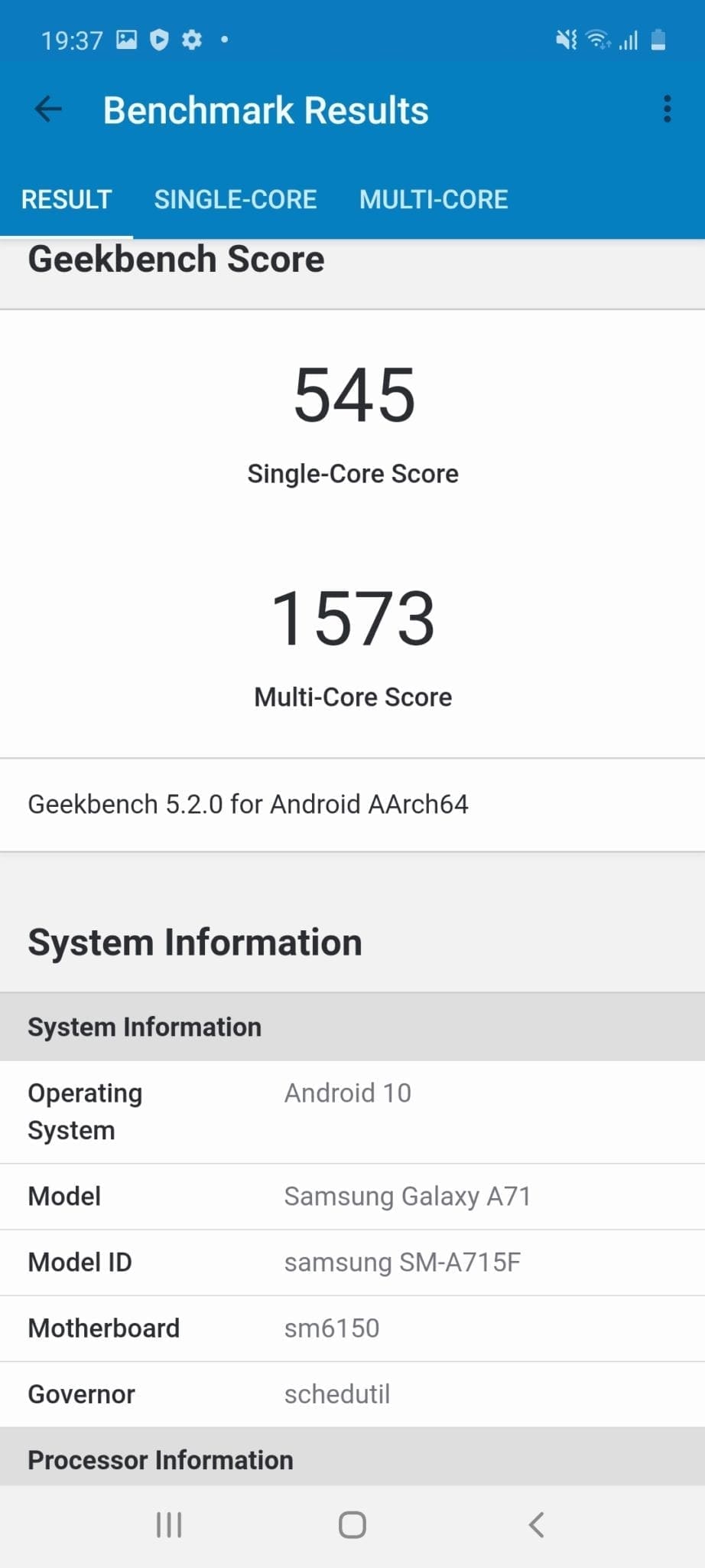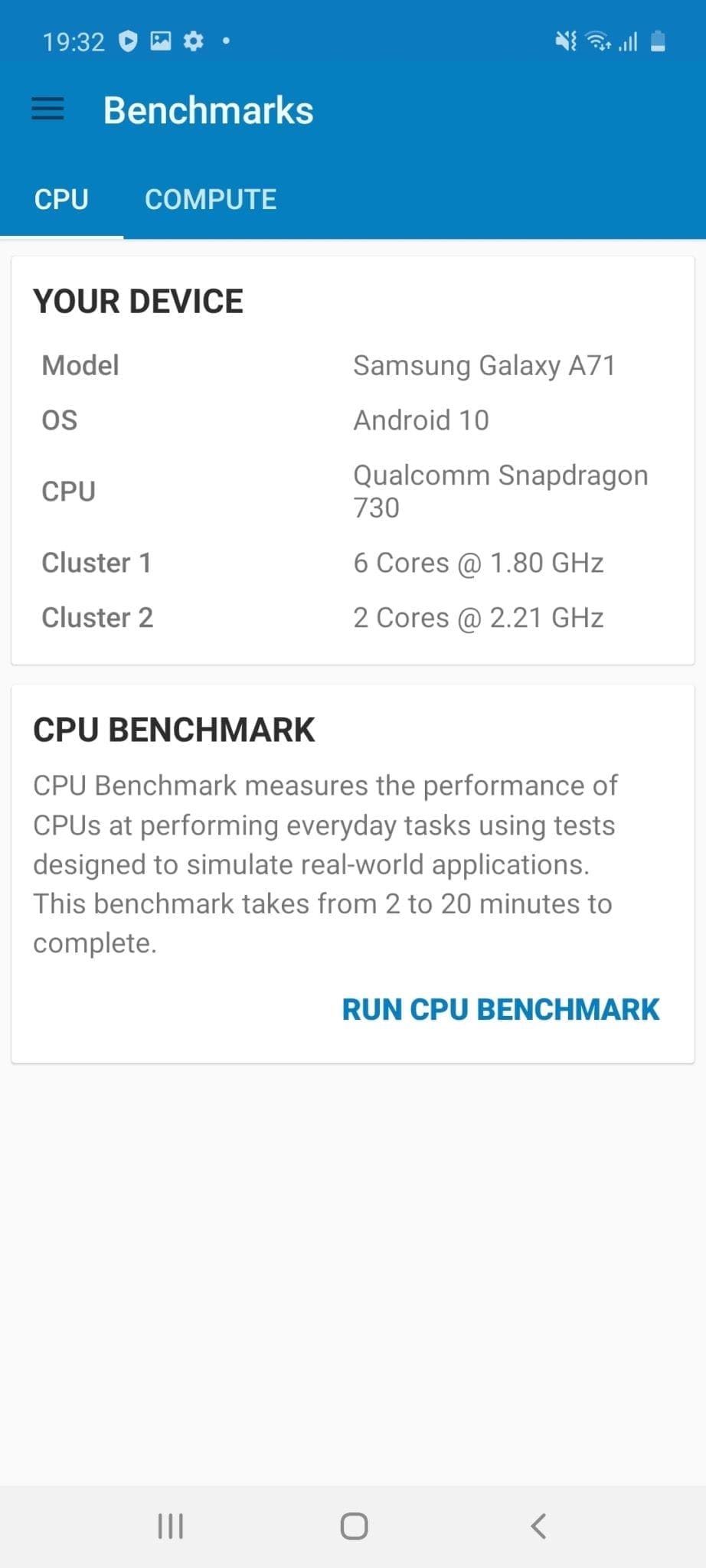 Samsung Galaxy A71 adăpostește la interior un procesor Snapdragon 730 de la Qualcomm, un model octa core din clasa mijlocie superioară, care conlucrează perfect cu cei 6 GB de memorie RAM. Toată greutatea cade pe umerii procesorului tactat la o frecvență de 2,2 GHz și pe cel grafic Adreno 618. În plus, dispune de un spațiu intern de 128 GB (deține și slot MicroSD), din care utilizatorul are la liber 107 GB. L-am supus mai multor scenarii de utilizare și l-am trecut și prin jocuri unde grafica este esențială – nu am constatat vreo slăbiciune, iar imaginile cu rezultatele obținute în testele sintetice de benchmark confirmă cele spuse.
