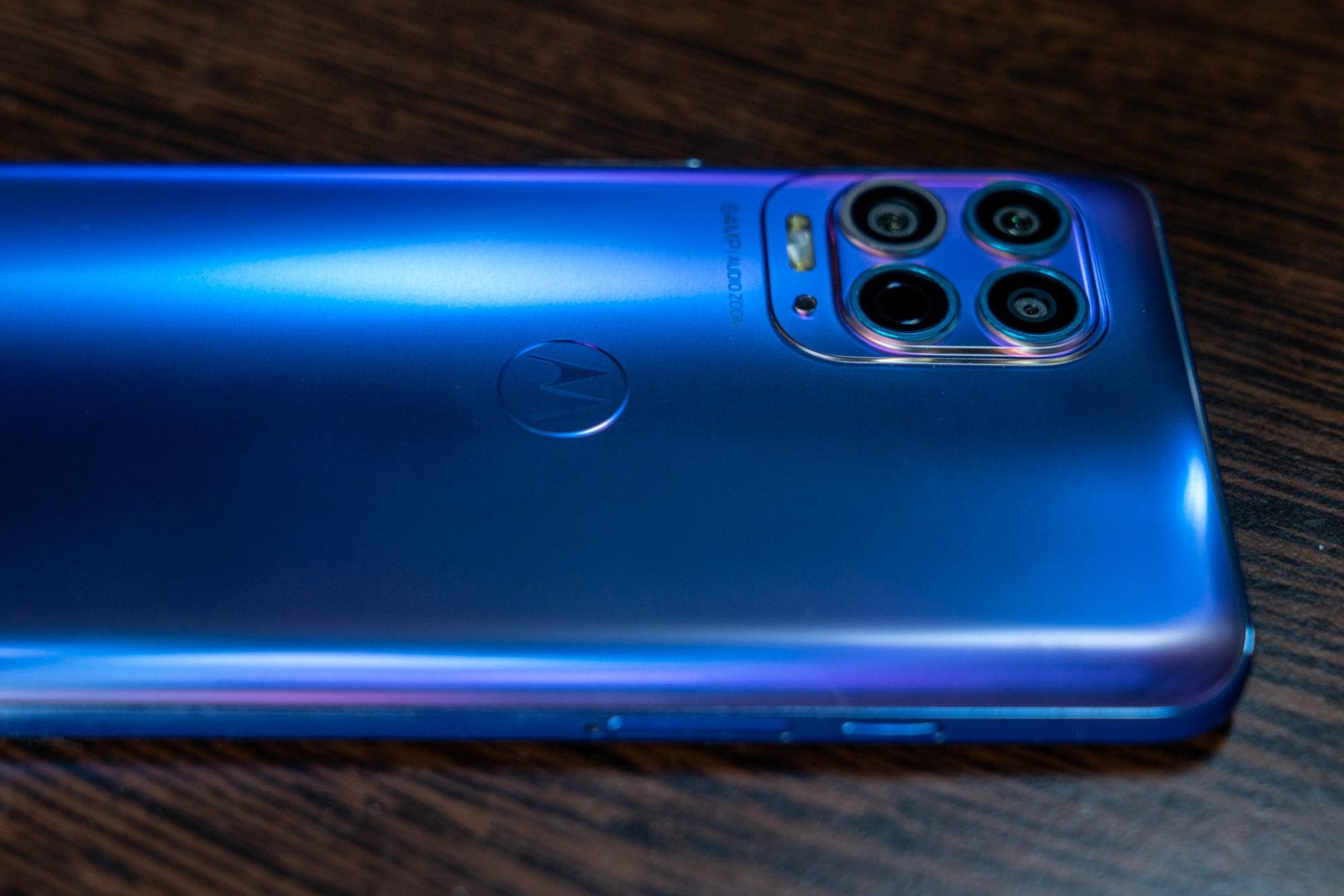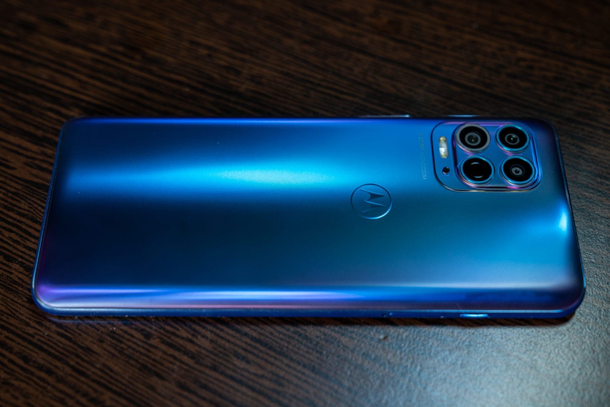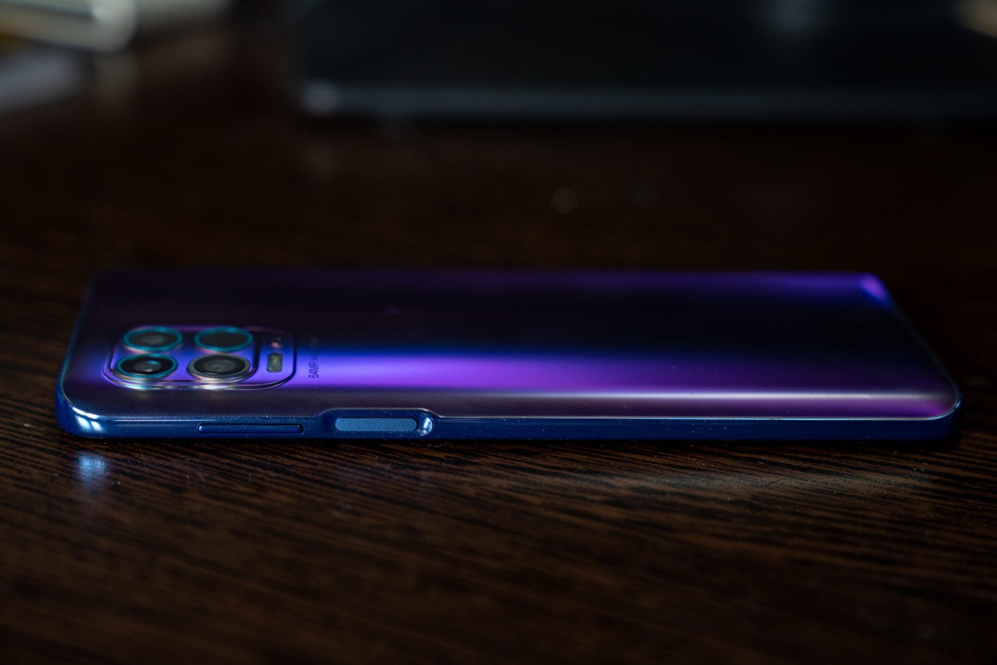Știu că asta poate părea o exagerare, însă nu simt că este una, după ce am utilizat acest telefon. Principalul lucru care trădează însă adevărata apartenență a lui moto g100 este design-ul, unul care „strigă” cuvântul midrange: un spate din plastic cu nuanțe spectaculoase de albastru și violet care strălucesc în lumină și un finisaj mat, dar care tot va aduna amprente. E o combinație de elemente caracteristică midrange-urilor Motorola, cu implementări premium care sunt amestecate cu unele mai necesare, ca urmare a prețului redus.