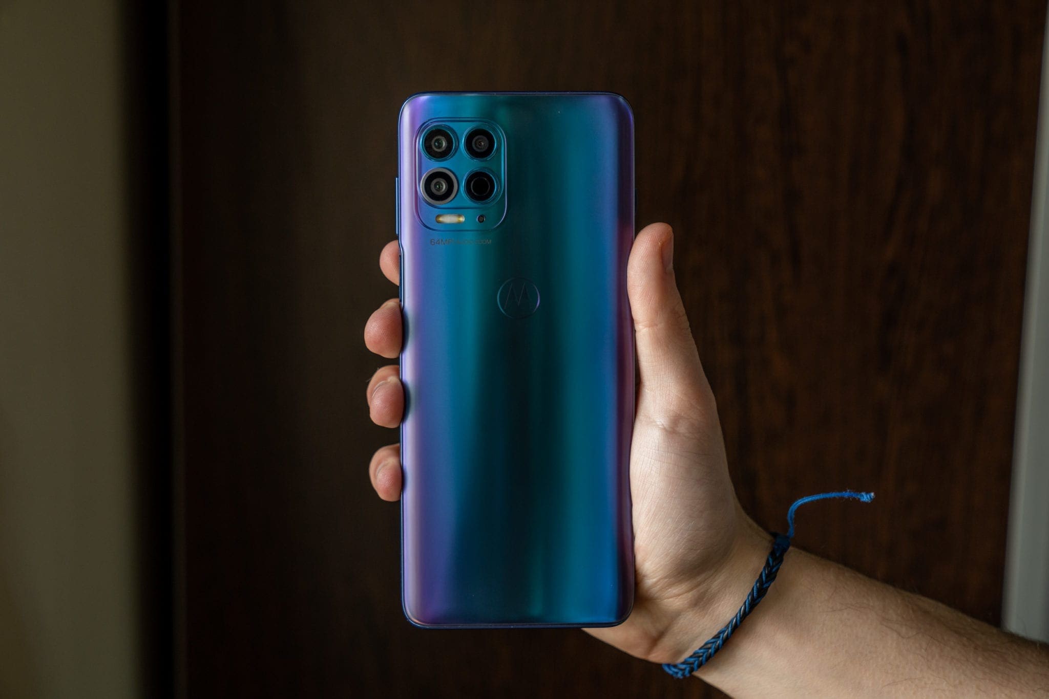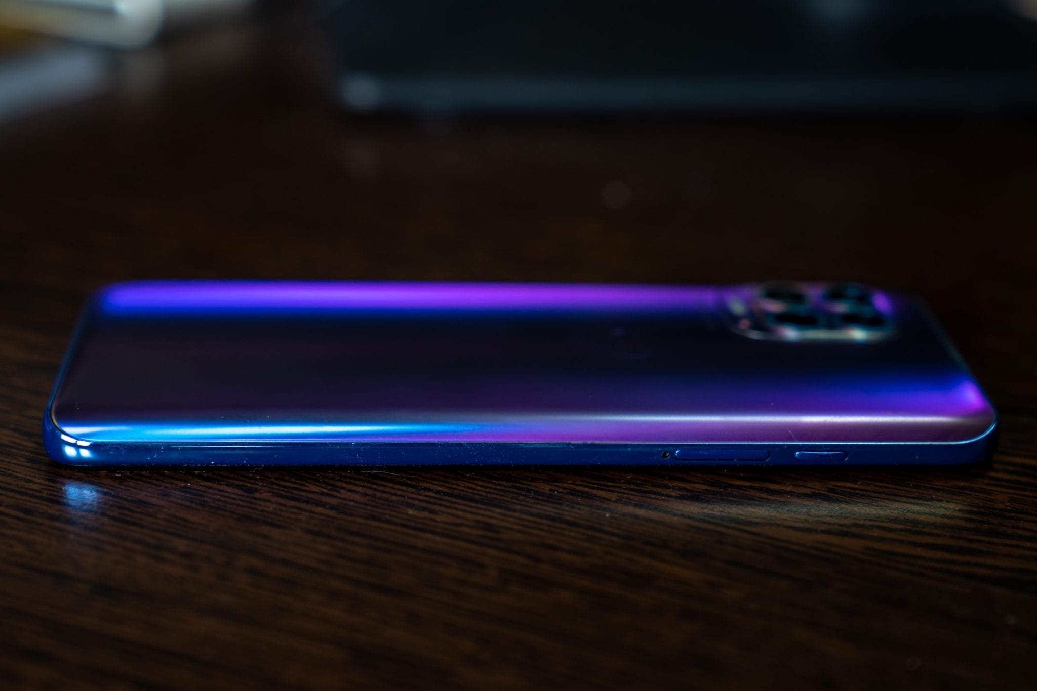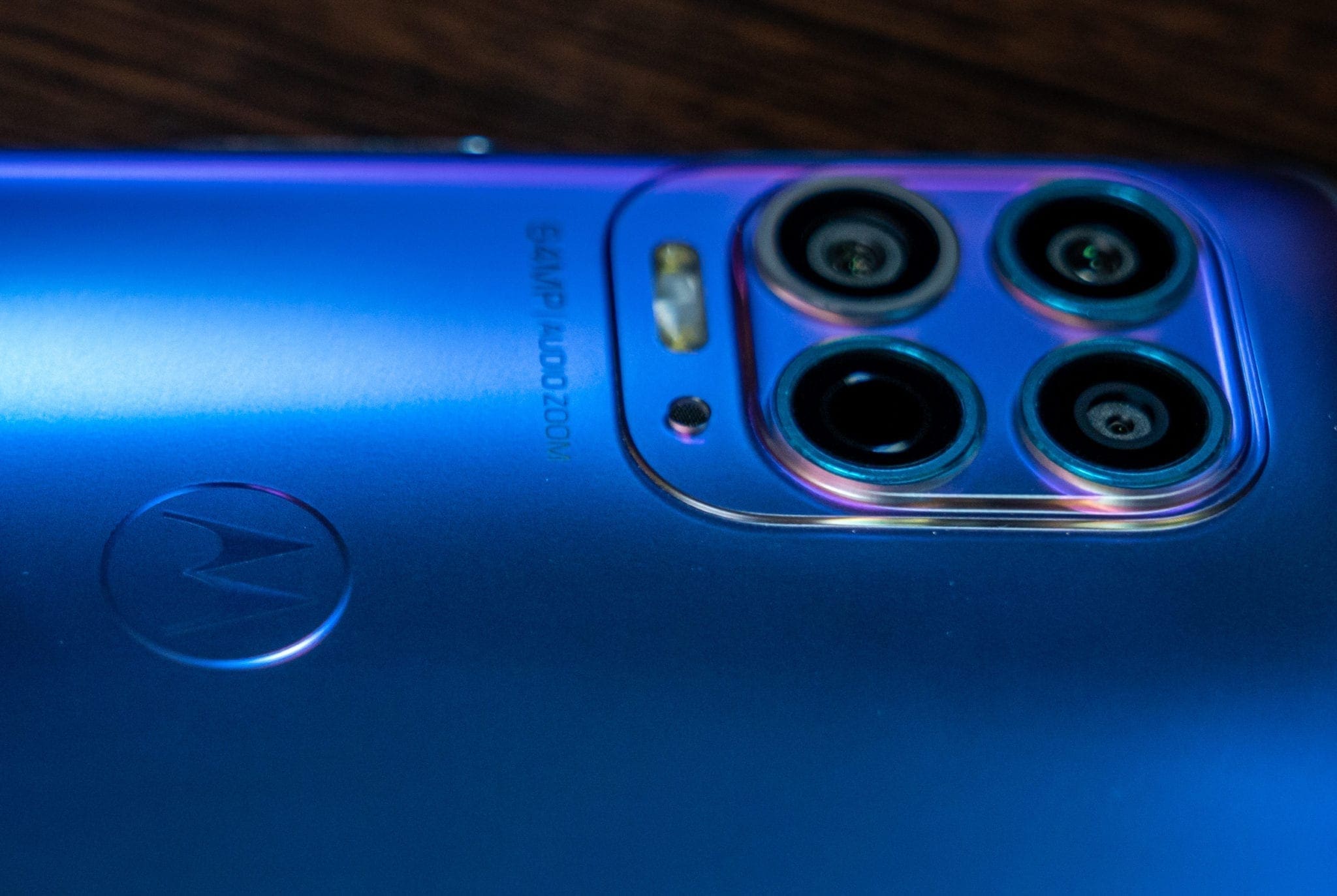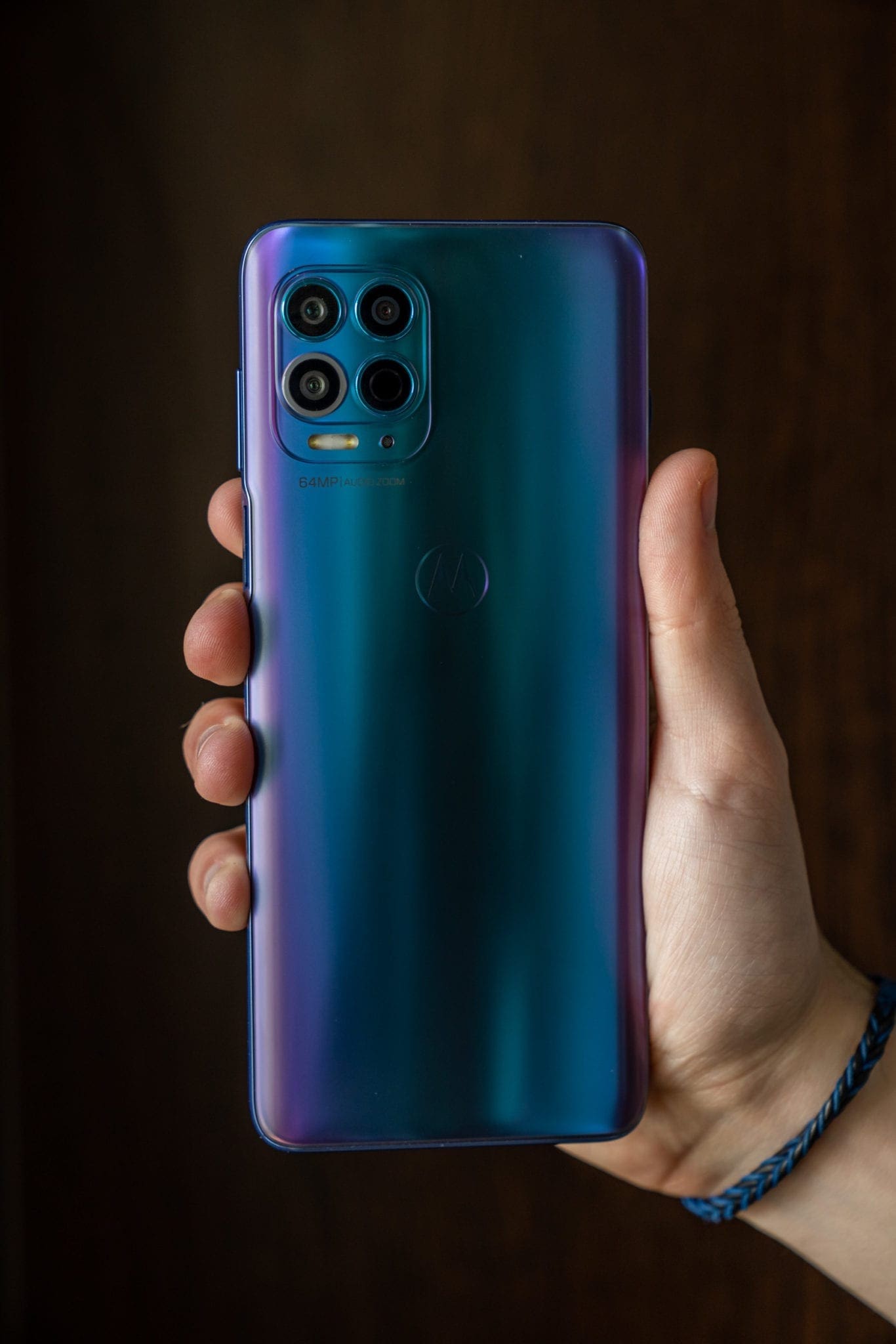 Știu că asta poate părea o exagerare, însă nu simt că este una, după ce am utilizat acest telefon. Principalul lucru care trădează însă adevărata apartenență a lui moto g100 este design-ul, unul care „strigă” cuvântul midrange: un spate din plastic cu nuanțe spectaculoase de albastru și violet care strălucesc în lumină și un finisaj mat, dar care tot va aduna amprente. E o combinație de elemente caracteristică midrange-urilor Motorola, cu implementări premium care sunt amestecate cu unele mai necesare, ca urmare a prețului redus.