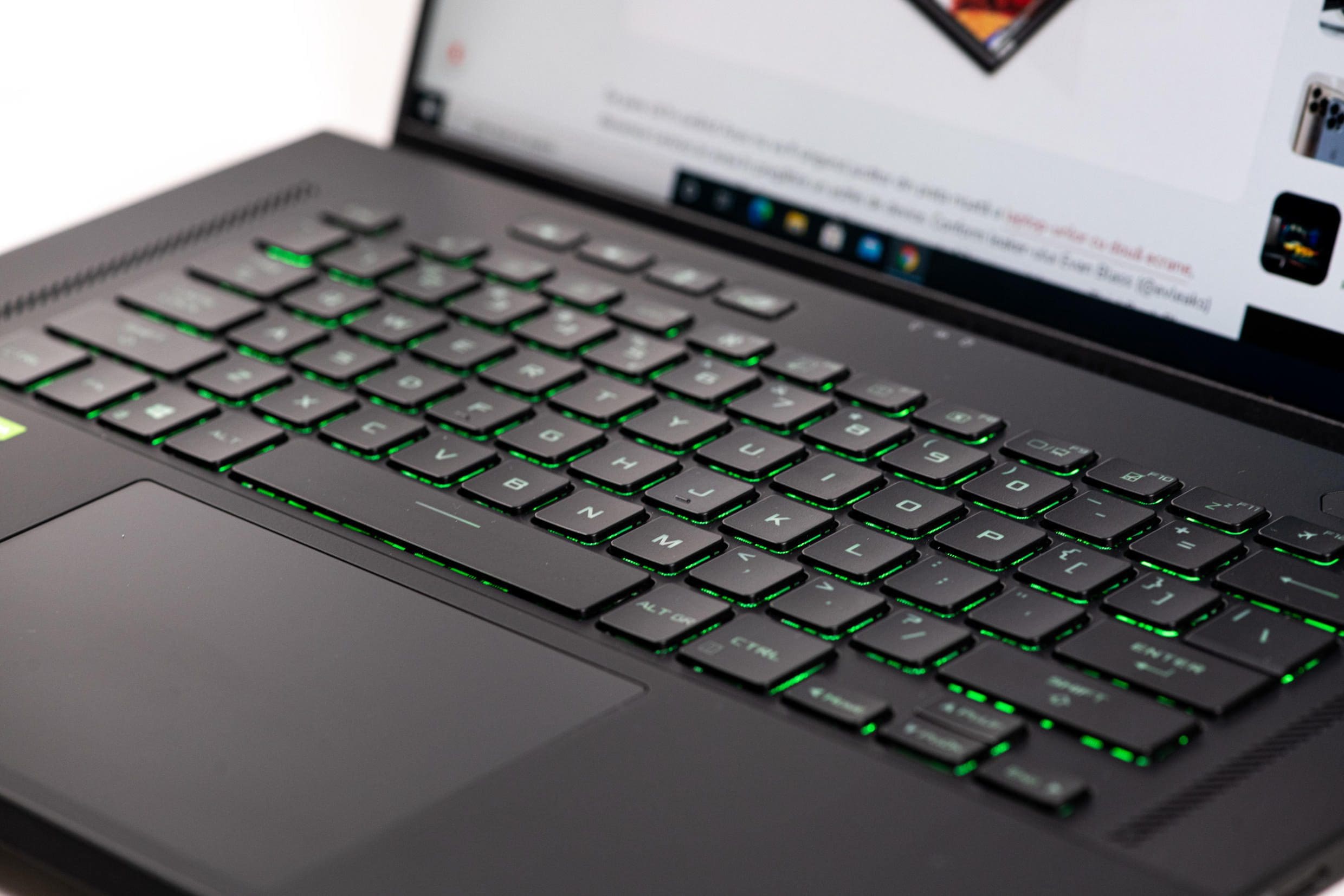 Tastatura laptopului este una RGB, fără numpad, iar în partea superioară se găsesc butoanele dedicate pentru volum, microfon și un buton special care pornește aplicația dedicată Armoury Crate. Feedback-ul tastelor este unul destul de ferm și se observă foarte clar punctul de acțiune. Dacă vii de la o tastatură similară Asus te vei obișui rapid, dar dacă vii de la un alt model vei avea nevoie de timp pentru acomodare.