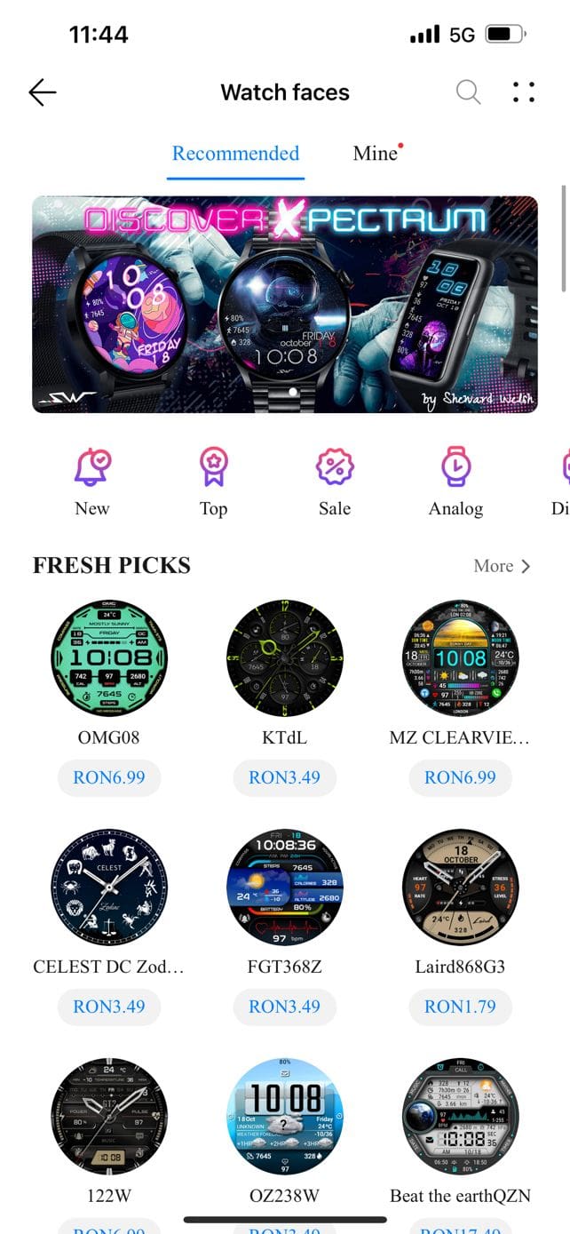 În aplicație se găsesc o duzină de fețe de ceasuri, dar trebuie să cauți destul de mult ca să găsești unele acceptabile. Sau poate ține de preferințe, dar mie mi-a luat câteva minute să le găsesc pe cele pe placul meu. Dar sunt multe opțiuni, atât gratuite, cât și pe bani, ceea ce este un lucru excelent. Costurile sunt modice dacă alegi opțiunile cu bani, câțiva lei per față, dar v-aș sugera să aveți răbdare și să dați scroll până găsiți unele care vă convin.