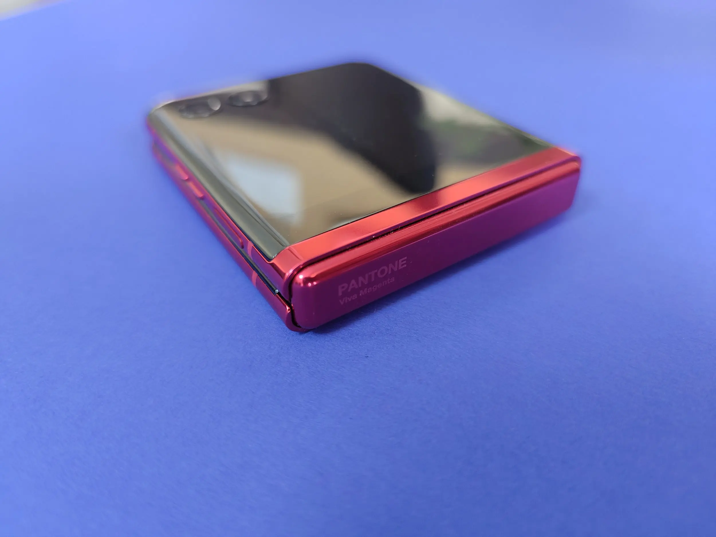 De asemena, trebuie să precizez că avem parte de un terminal extrem de compact atunci când este în poziția „pliat”, începând cu ușurință în orice fel de buzunar sau geantă. De asemenea, în această poziție și balamaua se prezintă într-un finisaj lucios, tot viva magenta, pe care este branduit logoul Pantone și numele culorii anului 2023. Per total, putem să privim acest smartphone și dintr-un punct de vedere fashion/lifestyle, și se bate acolo sus cu unele dintre cele mai frumoase designuri pe care le regăsim pe piață. Și aș mai îndrăzni să spun și că acest device are rolul și de a funcționa ca un accesoriu la ținuta ta, mai ales când vorbim despre segmentul feminin al utilizatorilor.