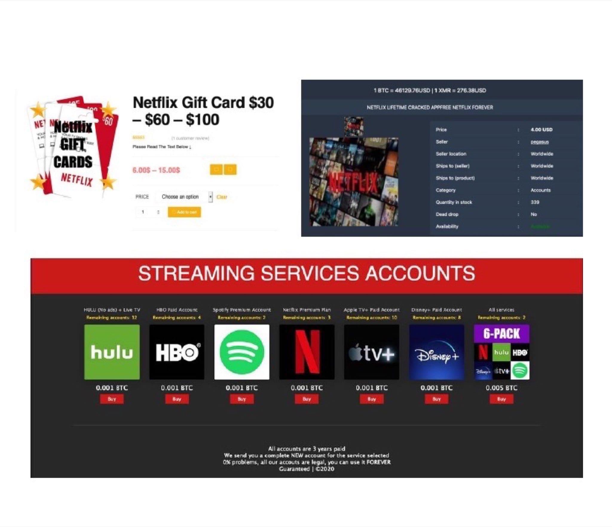 Servicii populare de filme online – fie că sunt furate datele de autentificare sau create cu carduri de credit compromise, conturile platformelor de streaming se vând la o fracțiune din costul unui abonament real și reprezintă una din categoriile care permite plata în criptomonede. De exemplu, un abonament pentru trei ani la Netflix se vinde cu 0,001 BTC (aproximativ 30 de dolari raportat la prețul zilei).