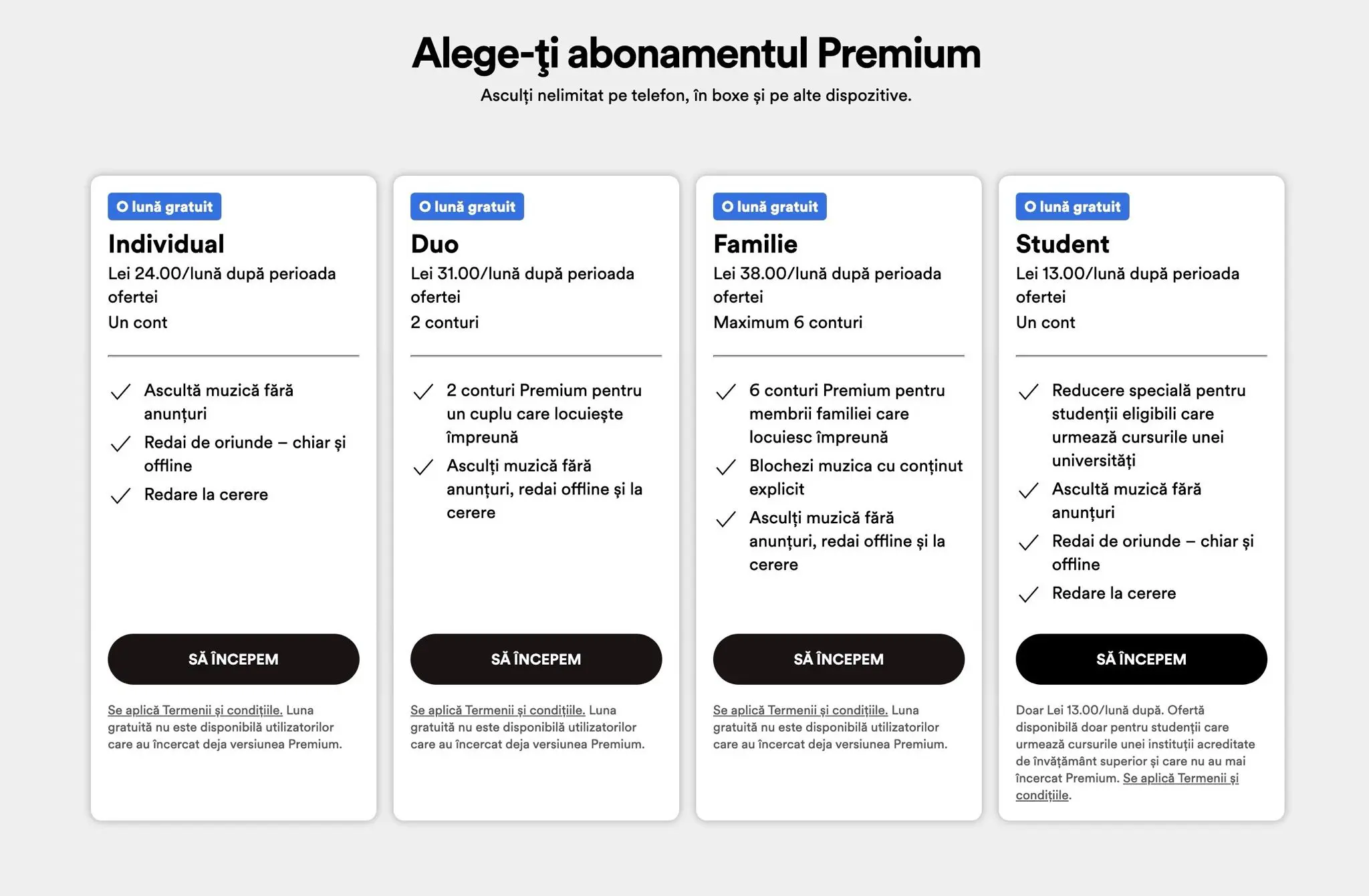 Noile planuri tarifare Spotify Premium pentru România sunt disponibile mai jos, iar utilizatorii au parte de o ofertă ceva mai avatajoasă decât pănă acum. De asemenea, prima lună este gratuită, dacă nu ai mai avut cont Spotify până acum, iar pentru utilizatorii existenți, dar care achitau până acum în euro, modificarea va surveni în mod automat odată cu următoarea lună tarifată.