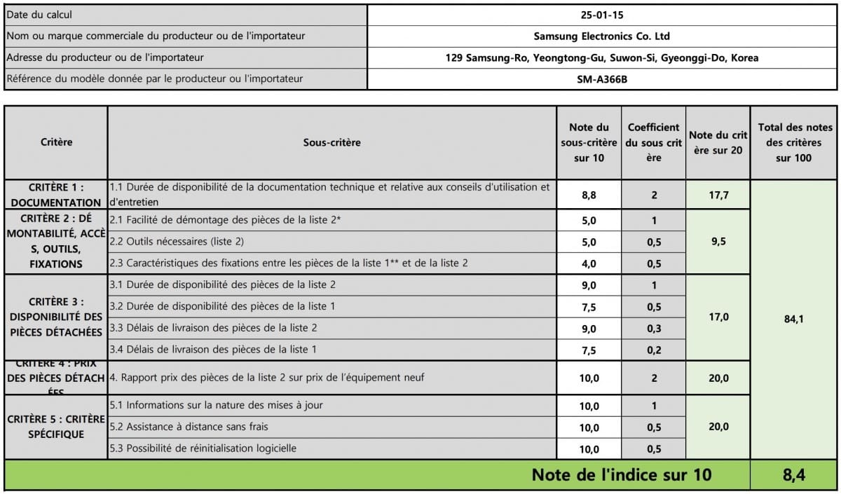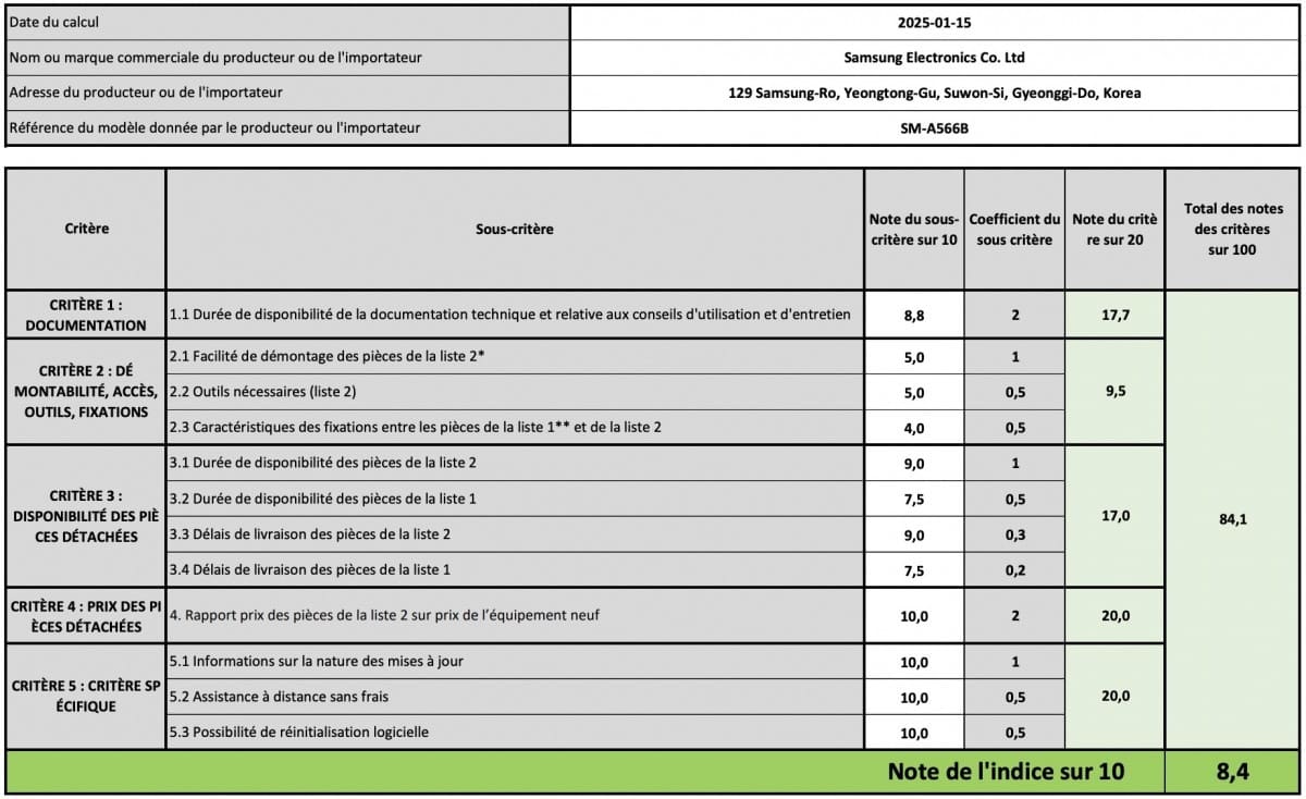 Autoritățile franceze au testat deja Galaxy A56 și A36, ca parte a procesului de aprobare pentru vânzare pe teritoriul țării. Prin acest proces trec majoritatea dispozitivelor electronice, iar pe baza unui barem pentru mai multe categorii este agregat un scor final de „reparabiltate”. Scorul pentru ambele dispozitive este de 8,4 puncte din 10, adică unul foarte înalt. Fișierele sunt găzduite chiar pe site-ul Samsung Franța, oferind credibilitate acestor informații.