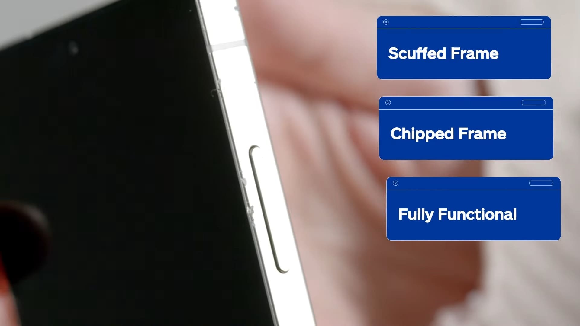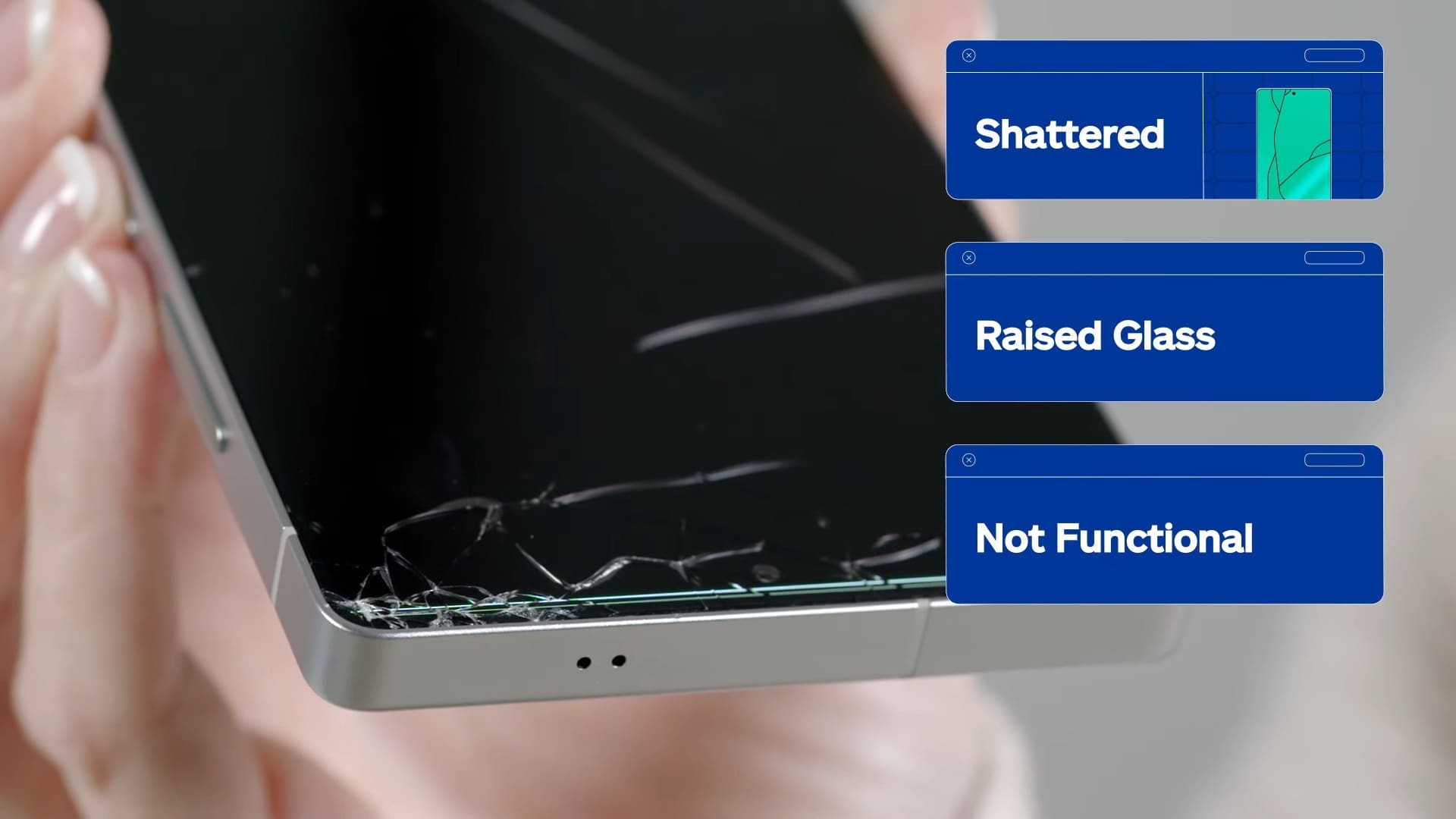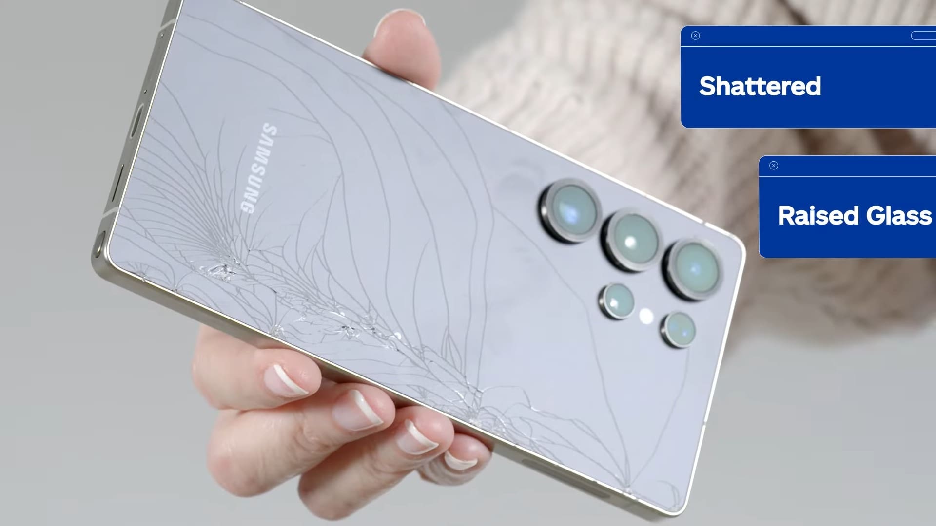 Mai multe dispozitive Galaxy S25 Ultra au fost „sacrificate” în numele științei. Toate au suferit căzături de la 1,82 metri (6 picioare), deci o înălțime mai mică decât cea recomandată de Corning pentru rezistență (2,2m). Primul dispozitiv a fost aruncat de la această înălțime cu ecranul în jos pe o suprafață de ciment, iar sticla s-a spart de la primul impact. Nu doar că aceasta s-a crăpat, dar cioburile au ieșit în relief, ceva ce poate deveni periculos pentru utilizator. Ecranul, la rândul său a cedat complet.