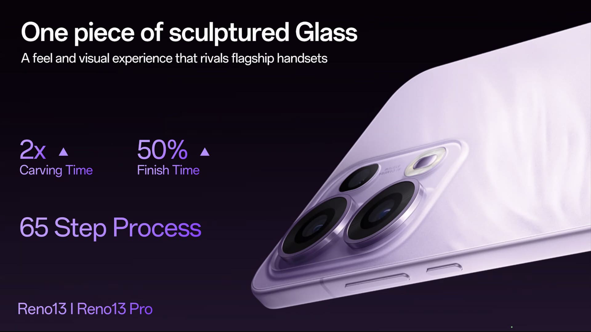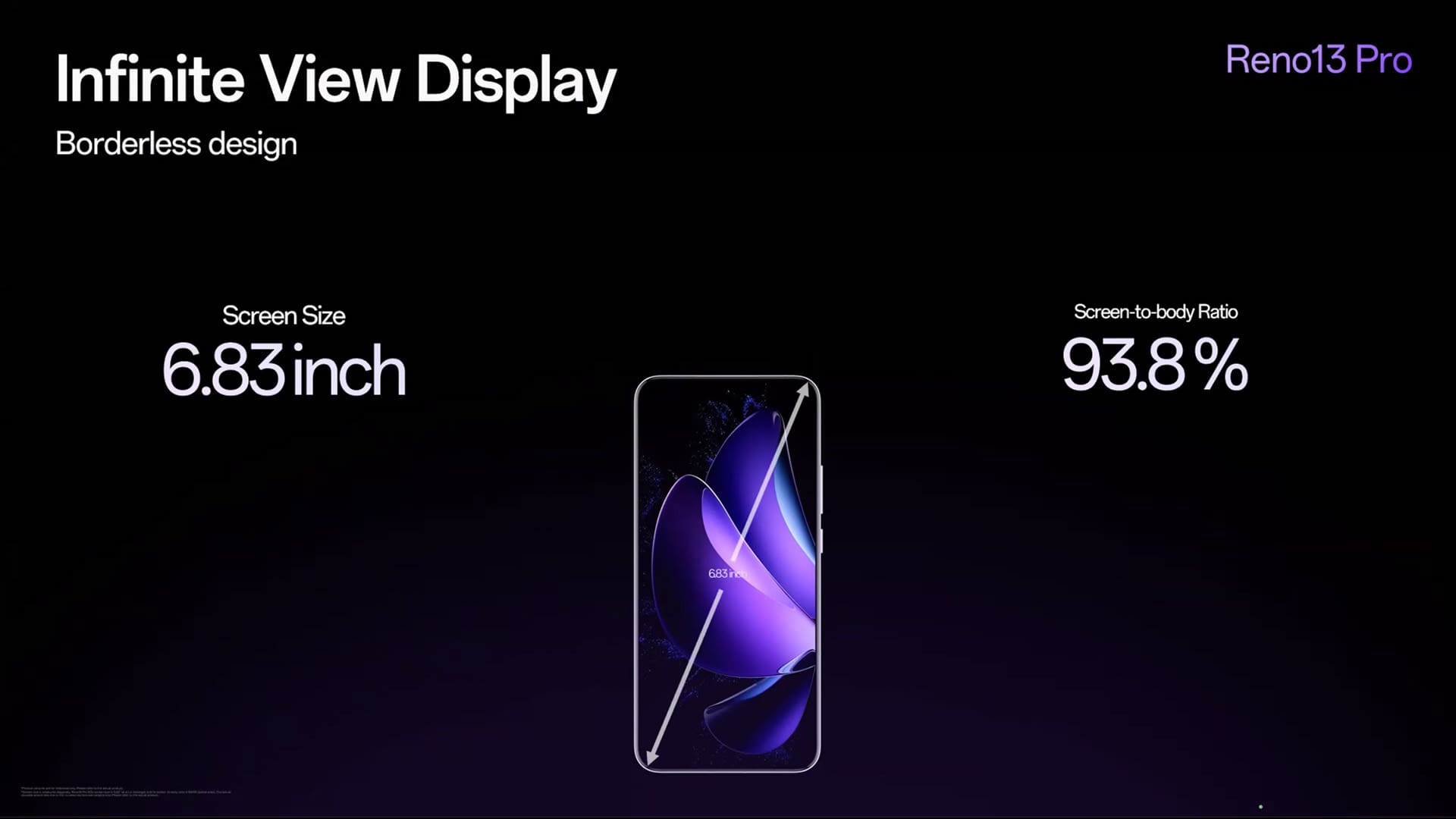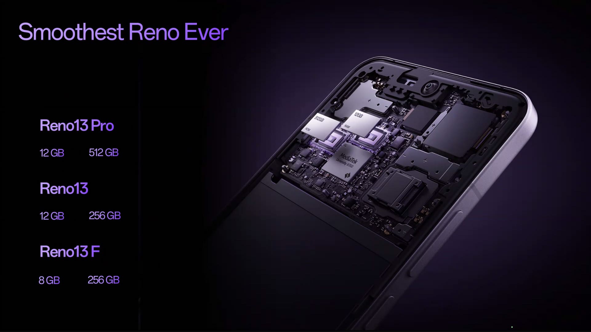 În cele din urmă, Reno13F este cel mai ieftin model al seriei. Acesta folosește componente ceva mai modeste, precum un ecran 1080p la 6,67”, tot la 120 Hz dar fără mod de funcționare la 90 Hz, este mai greu și mai gros decât celelalte variante la 7,76mm și 192 grame și este livrat cu același sistem de camere precum Reno13 „standard” pe spate, dar cu o cameră de 32 megapixeli pe față fără focalizare automată.