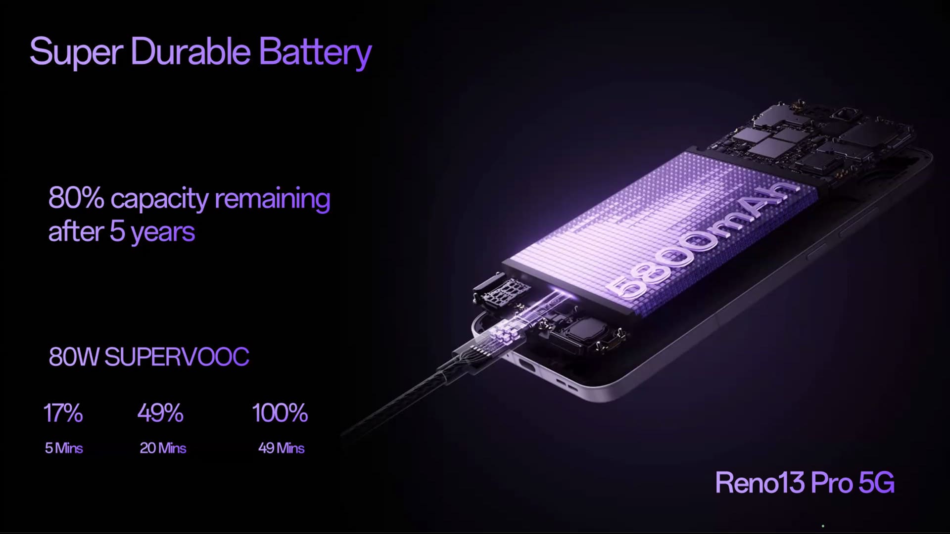 Reno13 Pro are și cea mai mare baterie din gamă, la 5.800 mAh și se încarcă rapid prin tehnologia SuperVOOC la 80W (17% în 5 min, 49% în 20 min, 100% în 49 min). Oppo spune că toată seria Reno13 va primi suport software pentru 6 ani, dintre care 5 sunt pentru actualizările de sistem. Având în vedere că se lansează cu Android 15 și interfața ColorOS 15, ar trebui să ajungă până la versiunea Android 20.