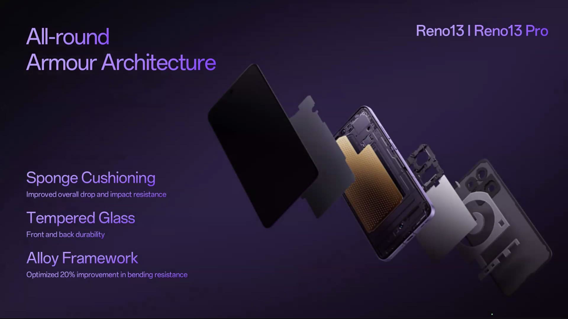 Atât Reno13, cât și Reno13 Pro folosesc ceea ce Oppo numește un sistem „Sponge Cushioning”, care preia impactul atunci când telefonul cade și se asigură că acesta va suferi daune minime la șocuri mecanice. De asemenea, Oppo a vorbit despre un sistem de răcire cu cameră de vapori de două ori mai mare decât cel de pe Reno12 și un sistem AI care monitorizează temperatura în gaming, pentru a asigura un framerate stabil și încălzire minimă.