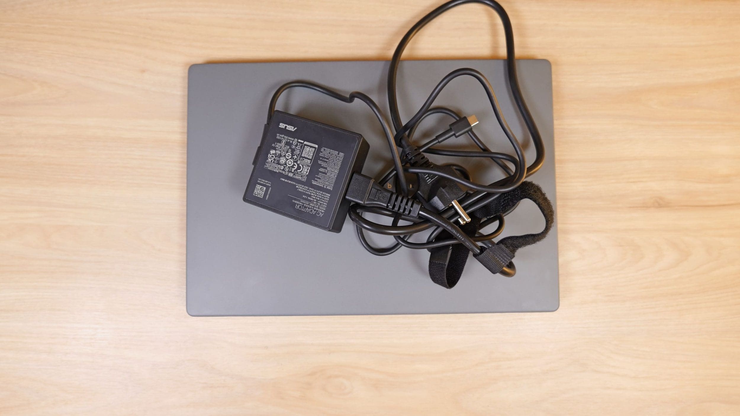 Apoi, încărcătorul de priză mi se pare din complet altă eră. Asus ar trebui să livreze laptop-urile sale cu încărcătoare similare cu cele pe care le oferă în cutiile telefoanelor, precum modelele din seria ROG Phone. Apreciez că acest încărcător are 90W putere, dar este prea greu, vine cu două fire, dintre care unul gros, greu de cărat după tine. Bine măcar că încărcarea este cu USB-C, deci dacă nu te deranjează o încărcare mai lentă, poți să îl încarci și de la un încărcător de telefon.