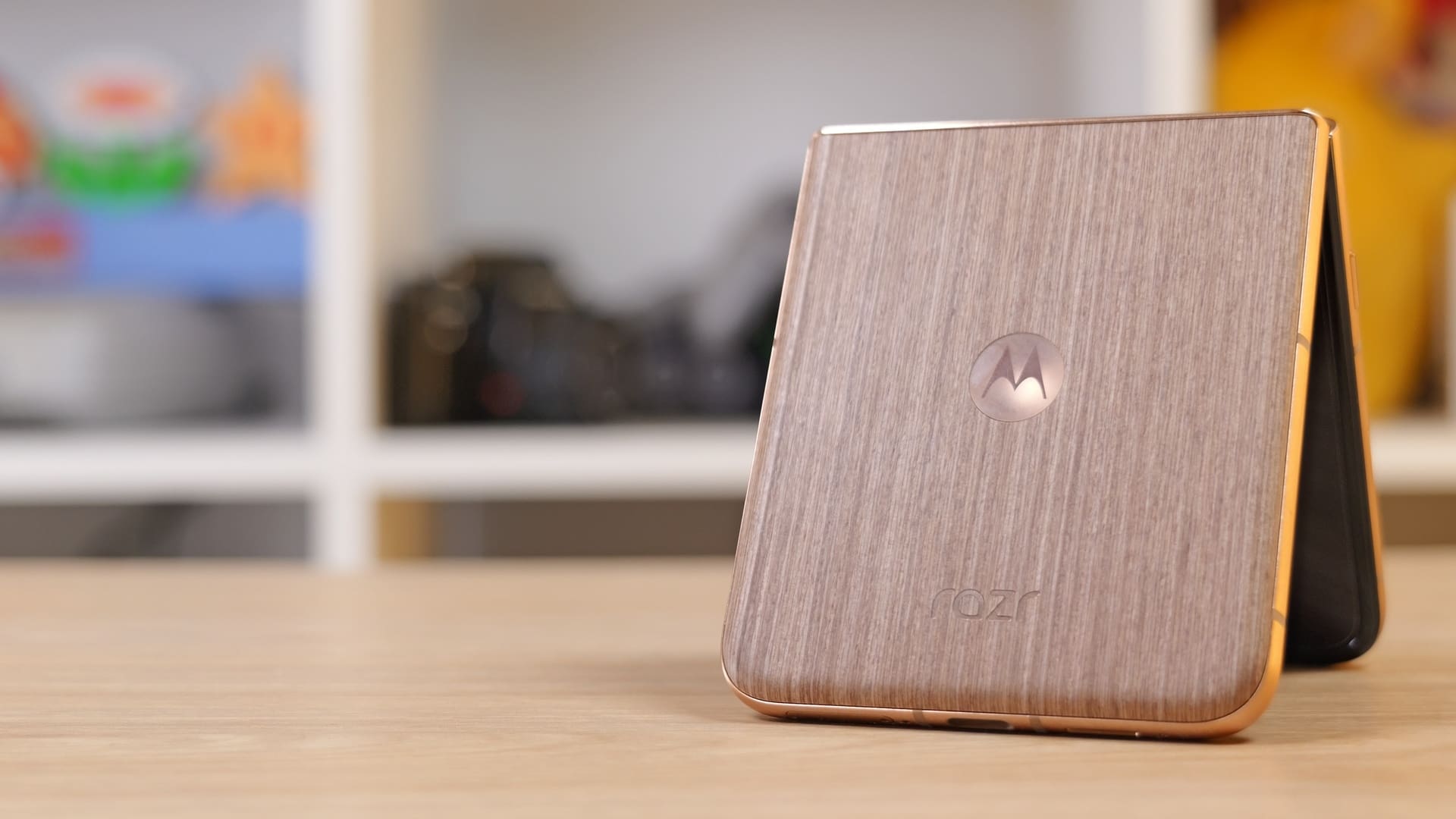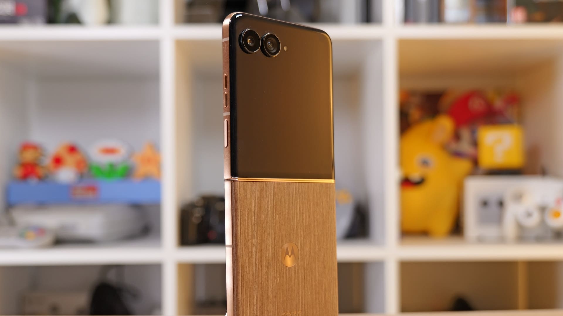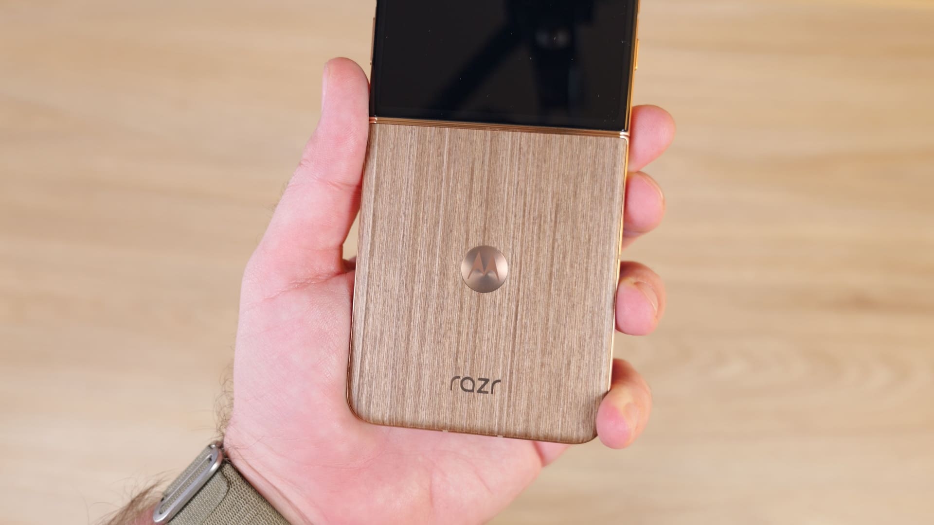 Chiar dacă la nivel de design nu pare că s-au schimbat multe de la razr 50 Ultra de anul trecut, Motorola se laudă pe noul model cu o serie de upgrade-uri la nivel de construcție. În primul rând, modelul pe care l-am testat venea vine cu acel spate care imită lemnul, pe care l-am întâlnit și pe Edge 50 Ultra (review). Este un element de design care iese imediat în evidență și care îmi place. Este aderent, elegant și inedit. Motorola spune că există și o versiune cu alcantara, pe care nu am văzut-o în realitate.