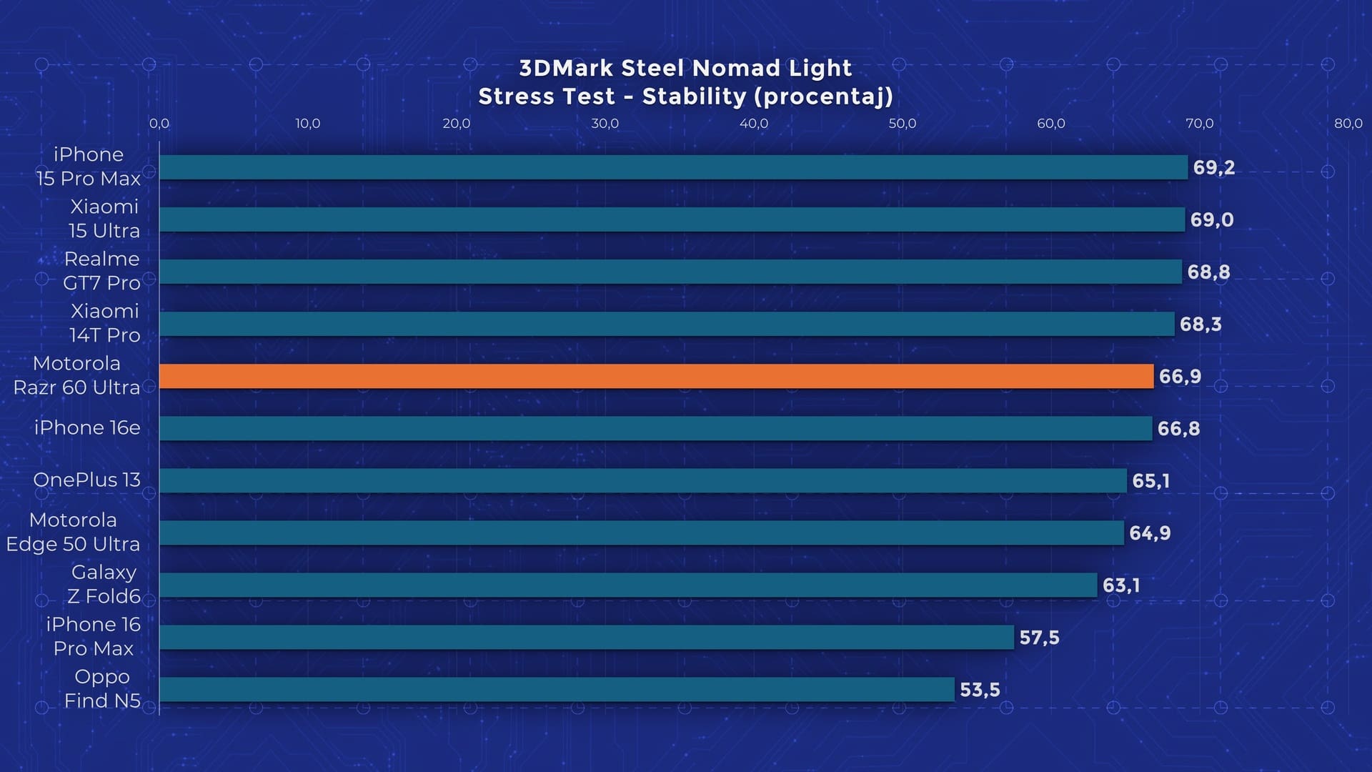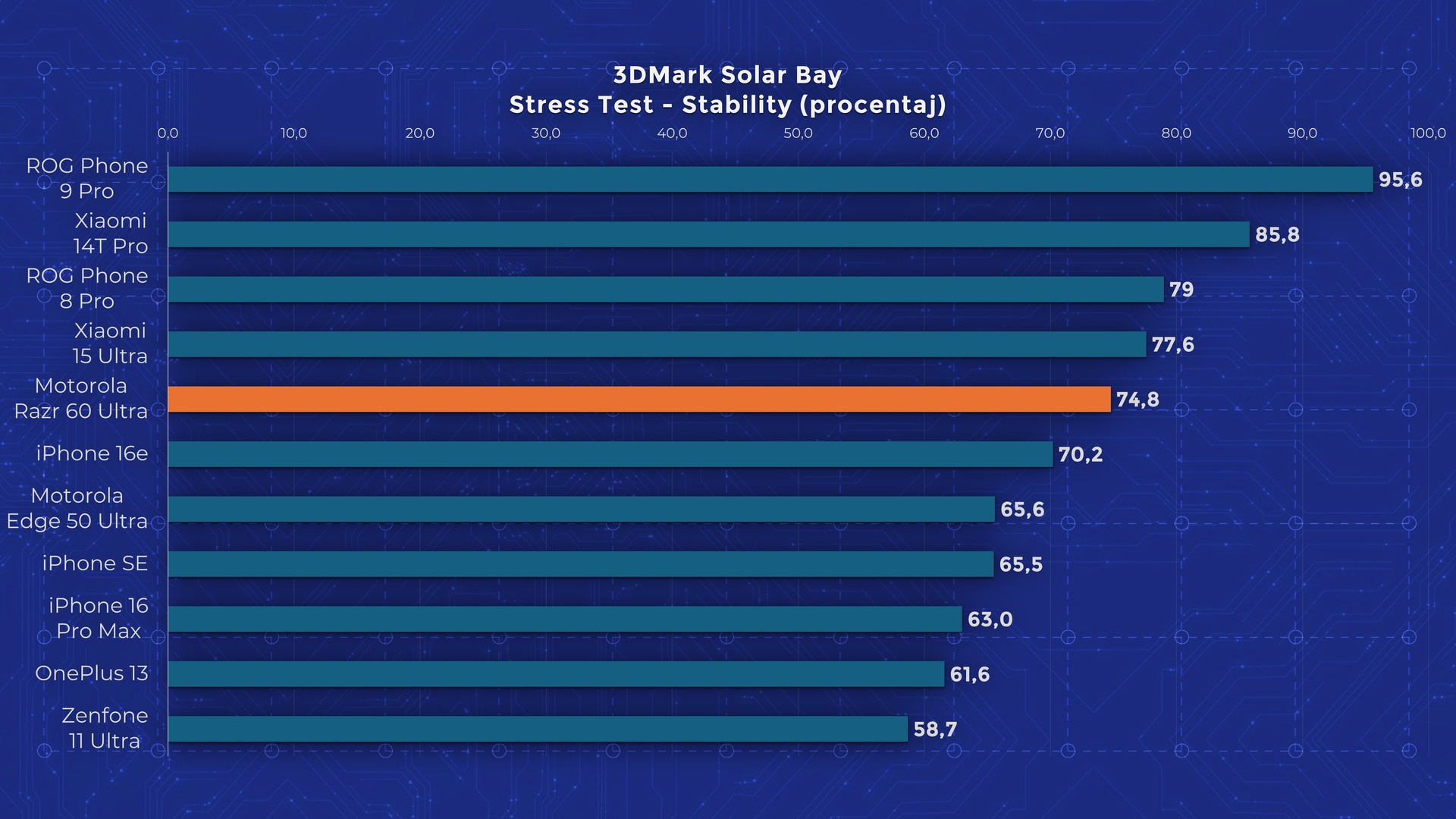La capitolul performanță, telefoanele pe acest format nu prea pot ține pasul cu modelele tradiționale, dar razr 60 Ultra încearcă să spargă aceste preconcepții. Reușește însă doar parțial. Avem primul Flip cu Snapdragon 8 Elite și 16 GB RAM din piață, iar în testele de performanță a reușit să mă impresioneze. Performanță este cu doar puțin în urma altor flagship-uri ale momentului și reușește chiar să reziste bine și în testele de stress cu 65-75% din performanță păstrată. Depășește astfel și modele tradiționale din ultimele luni. Din păcate, în testul de stres Wild Life Extreme, se încinge peste limite fix înainte de final și telefonul se închide complet. Poate fi un bug software, având în vedere că celelalte teste sunt trecute fără probleme.