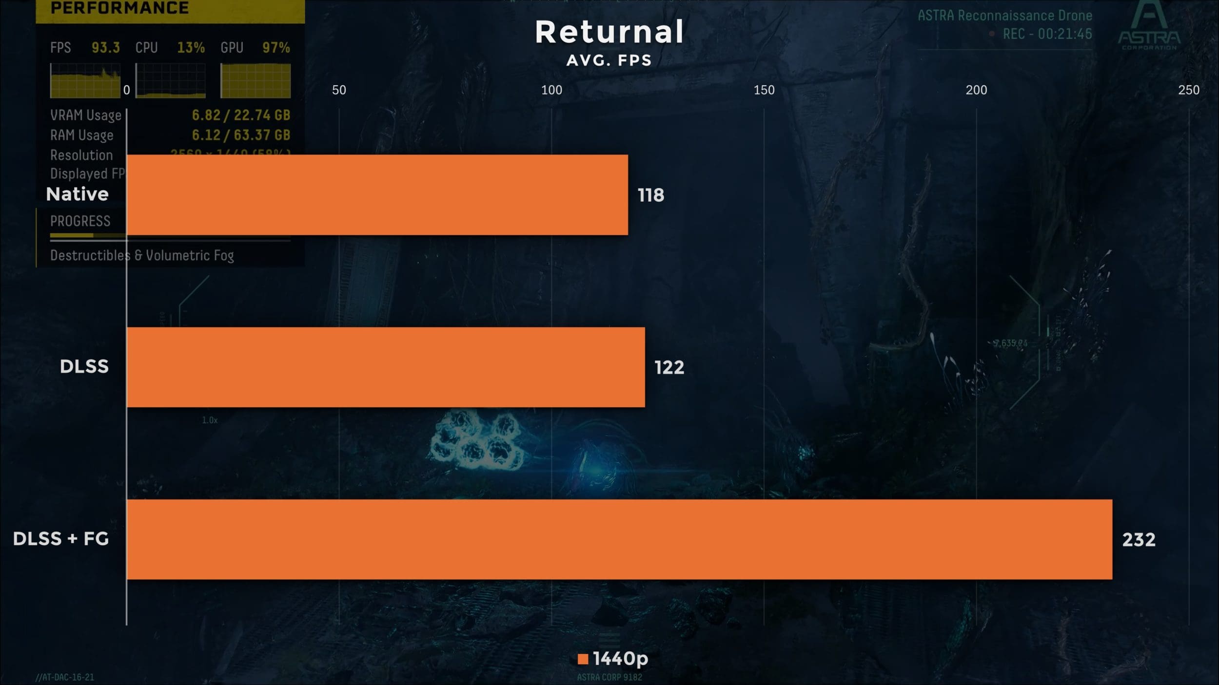 Trebuie menționat că toate aceste jocuri sunt rulate pe cele mai înalte setări posibile. Cu cele mai înalte profiluri de ray tracing sau path tracing, și cu DLSS setat pe „Balanced”, setarea recomandată pentru rezoluția QHD a monitorului intern. De altfel, toate jocurile sunt rulate în 2.560 x 1.440. Singurul joc care mi-a dat bătăi de cap a fost Returnal, care nu întoarce framerate-ul cu frame generation în Benchmark. Pentru acesta soluția este să înmulțești cu 2 rezultatele.
