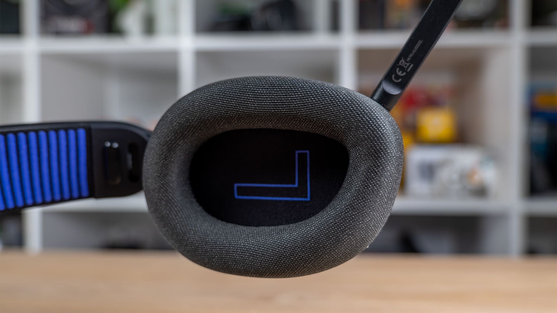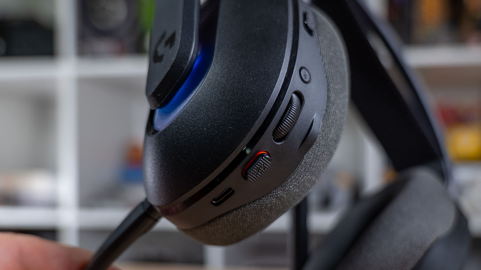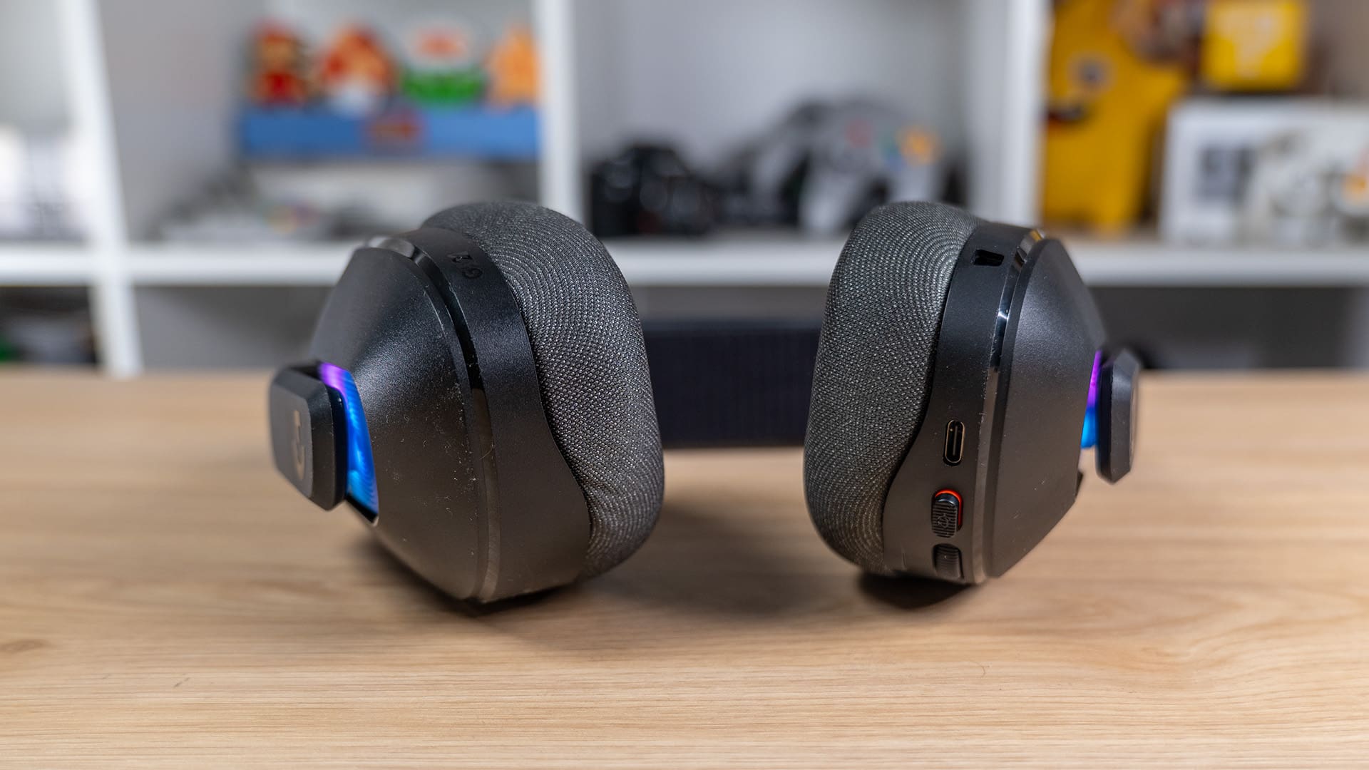 Și cupele lui G522 sunt realizate din același plastic precum banda de sus, dar acestea sunt ceva mai frumos decorate: avem câte două zone luminoase în centru, fiecare având patru zone RGB personalizabile, în spatele unui panel de plastic cu striații. Toate butoanele de control se află pe partea stângă: un slider on/off, un buton pentru schimbarea sursei (Lightspeed sau Bluetooth), o rotiță de volum care are și o bucată de plastic ieșită în relief lângă, care ajută la ghidaj, un buton „mute” pentru microfon și port-ul USB-C care poate fi folosit atât pentru redare audio pe fir, cât și pentru încărcare.