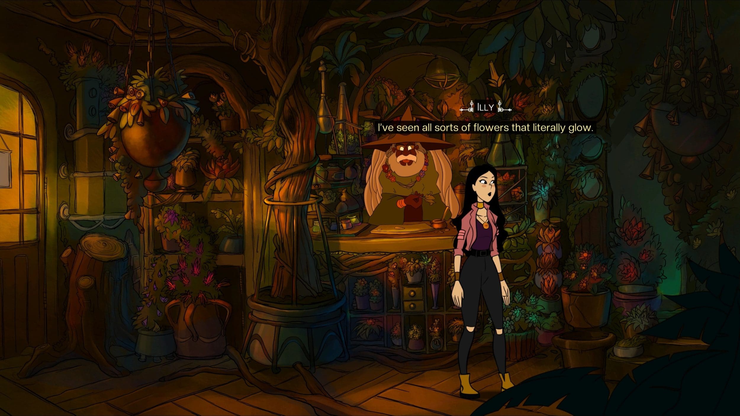 Tot din cauza dimensiunii jocului am observat și anumite „scurtături” pe care Stuck in the Attic le-a luat pentru a putea livra un joc atât de ambițios. Alegerea realizării unui joc mai mare cu zeci sau chiar sute de personaje unice (multe nu sunt interactive, dar apar în niveluri aleatoriu pentru a popula scenele), a dus, cred eu, la reducerea anumitor detaliilor în fundaluri. Nu vreau să fiu înțeles greșit. Near-Mage nu arată rău. Ba chiar are o atmosferă ca de basm, cu o paletă de culori vii. Abordează doar un alt stil, care suspectez eu că este mai ușor de „desenat” (doar o presupunere, nu am experiență în domeniul graficii). De aceea, cred că a fost făcută alegerea ca doar personajele principale importante să primească conversații cu Ilinca. Iar acestea sunt afișate pe întregul ecran cu animații simple ale mâinilor sau feței, ușor de refolosit în mai multe situații. M-a amuzat că seamănă cumva cu conversațiile dintr-un RPG, precum jocurile din seria The Elder Scrolls, inclusiv fundalul fiind ușor blurat, pentru un efect mai „cinematic”.