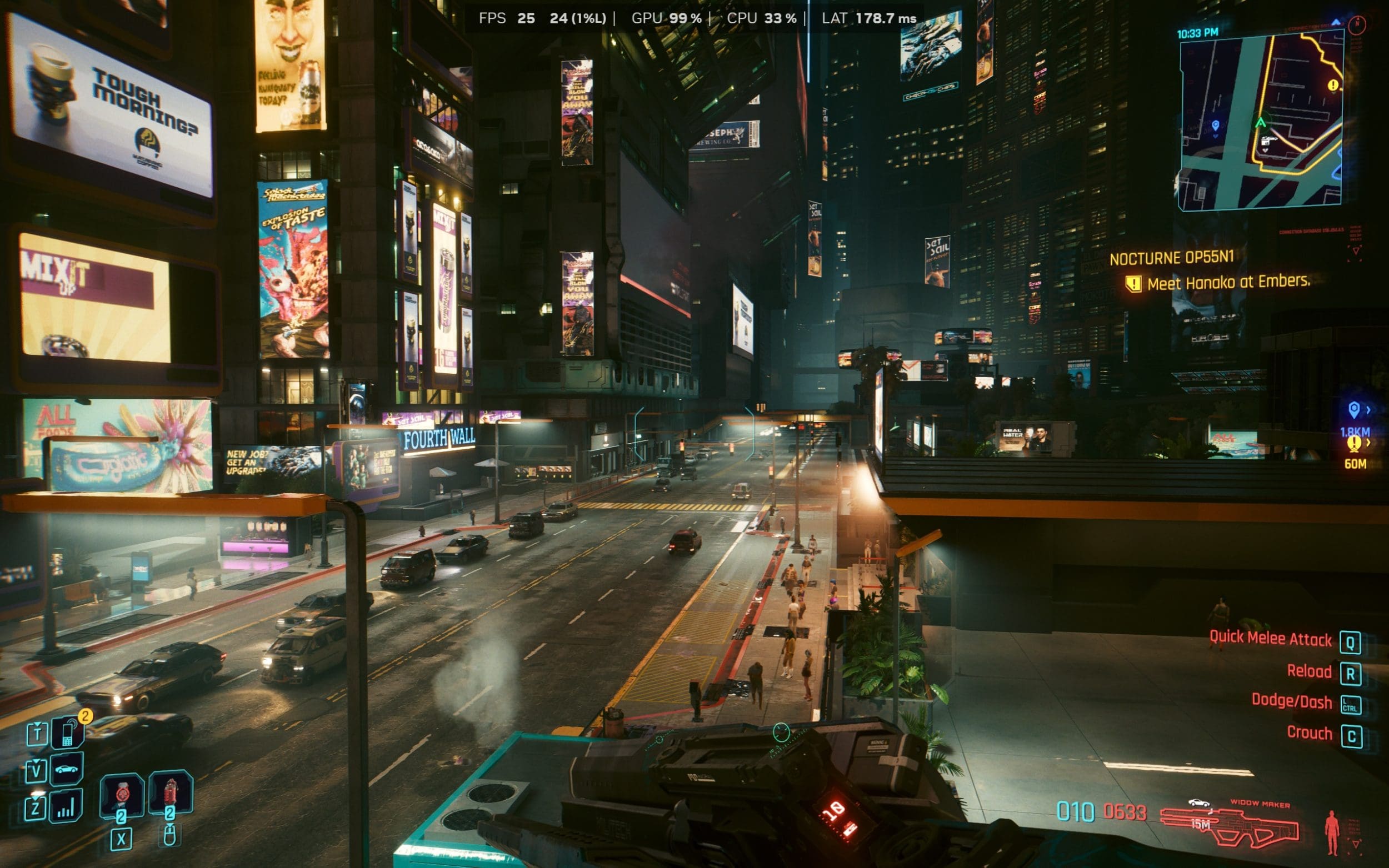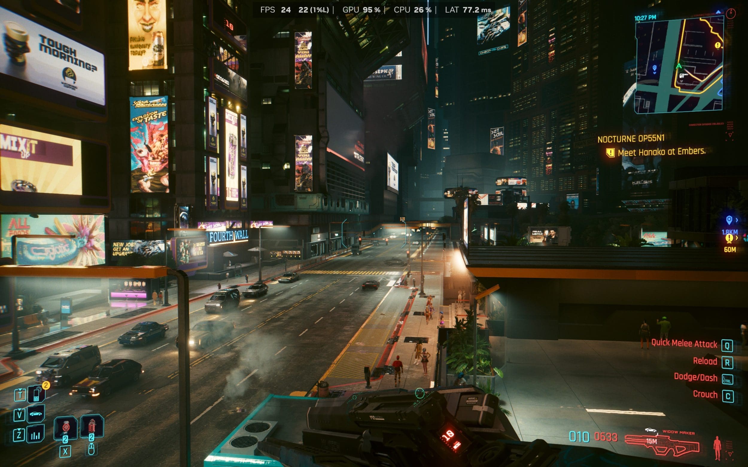 În cele din urmă avem Cyberpunk 2077, cu profilul Ray Tracing Overdrive. Pe rezoluția nativă, pornim de valoari similare cu Wukong: 25 FPS cu 178 ms latență, o experiență greu de jucat. Activarea Reflex scade latența la jumătate, la 82 ms, dar Boost-ul nu mai face o diferență atât de mare, scăzând doar până la 77ms.