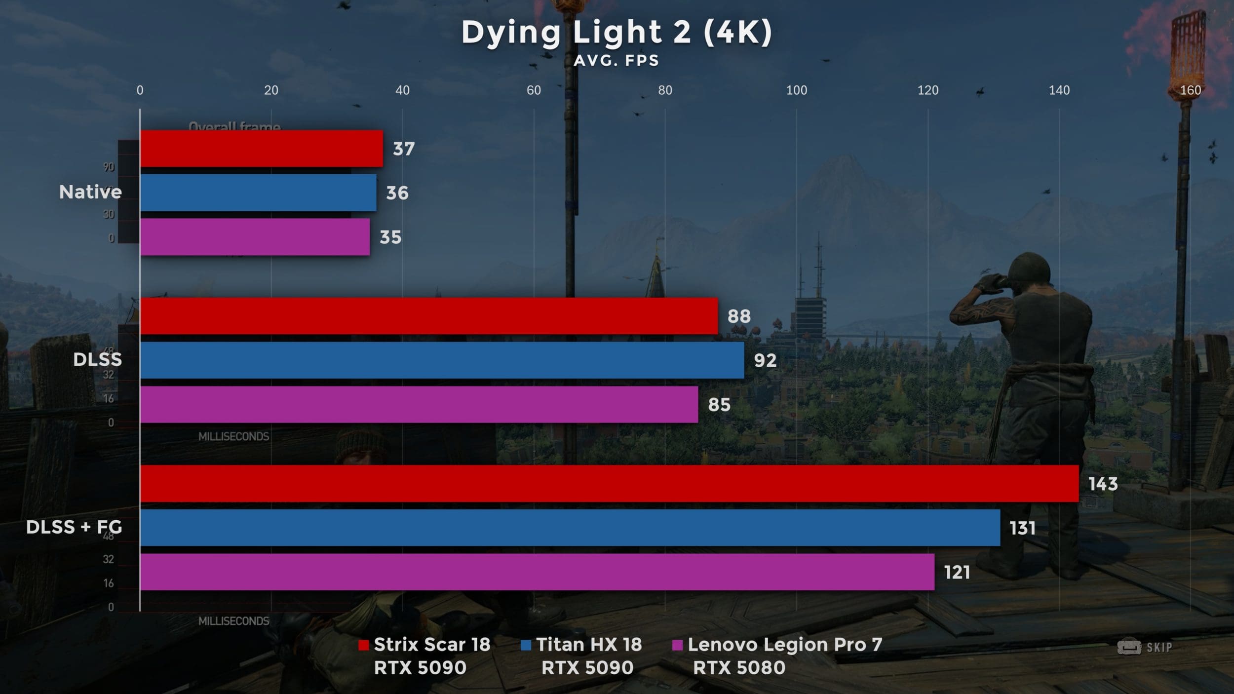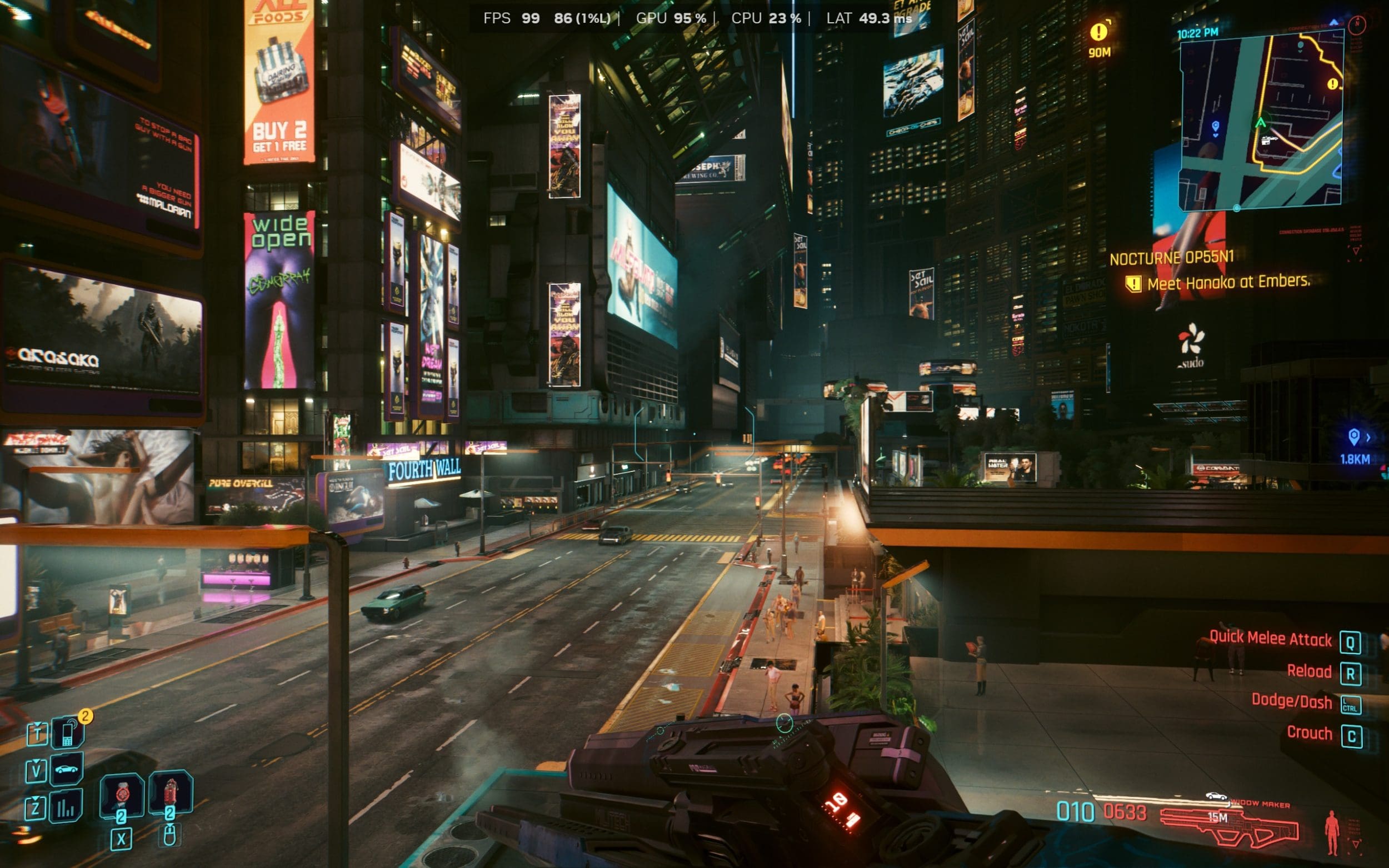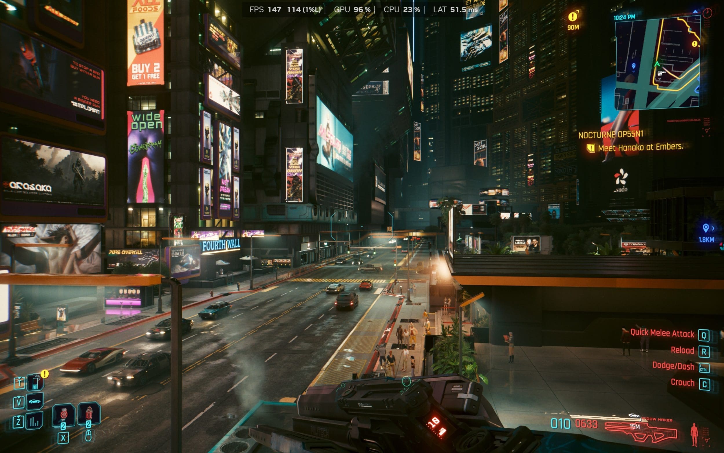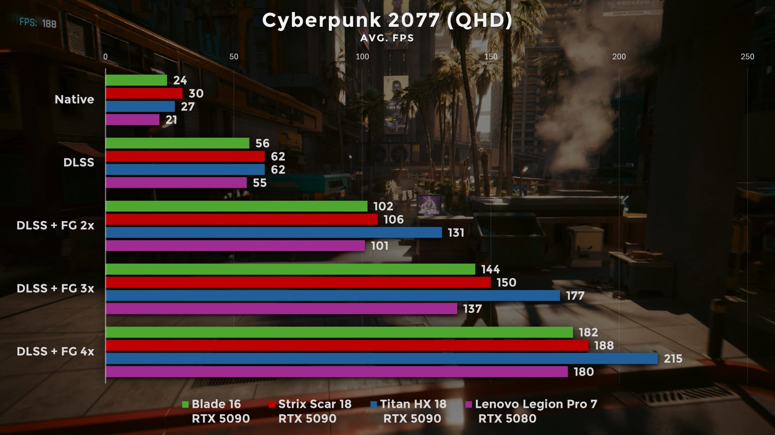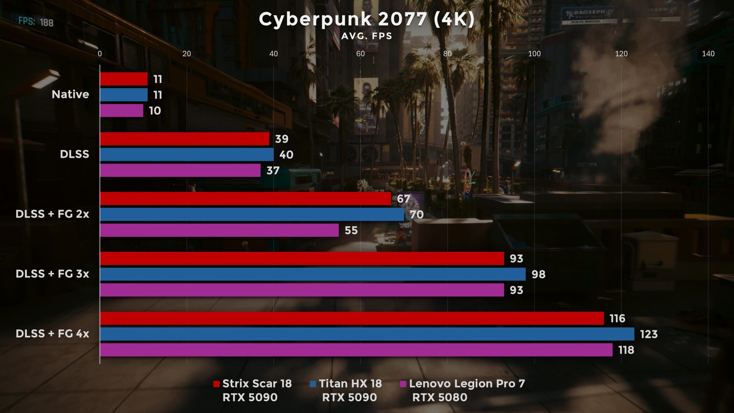Generarea de cadre este liniară în Cyberpunk, astfel, trecerea pe MFG 3X crește framerate-ul la 147 FPS, cu latență tot în jurul 50 ms, în timp ce abia MFG 4X nu mai crește la fel de mult framerate-u, dar il urcă totuși la 185 FPS cu 56 ms latență. Calitatea imaginii rămâne constantă, Cyberpunk având la rândul său DLSS4 cu model Transformer integrat.