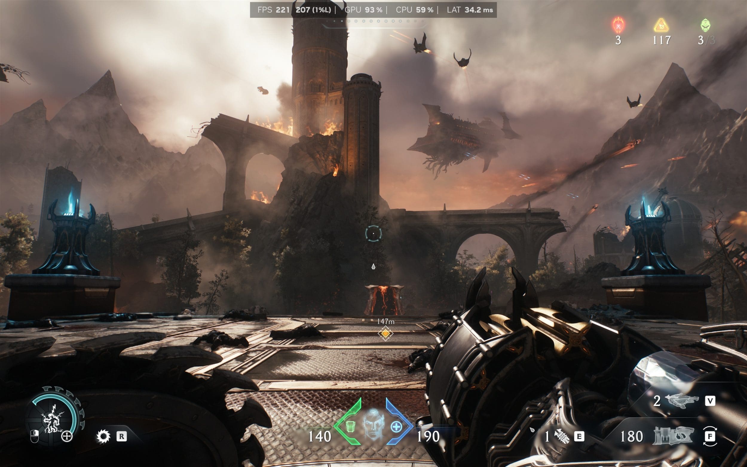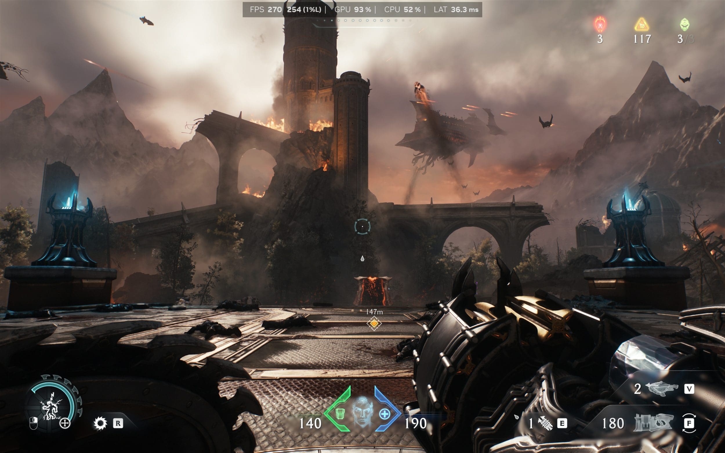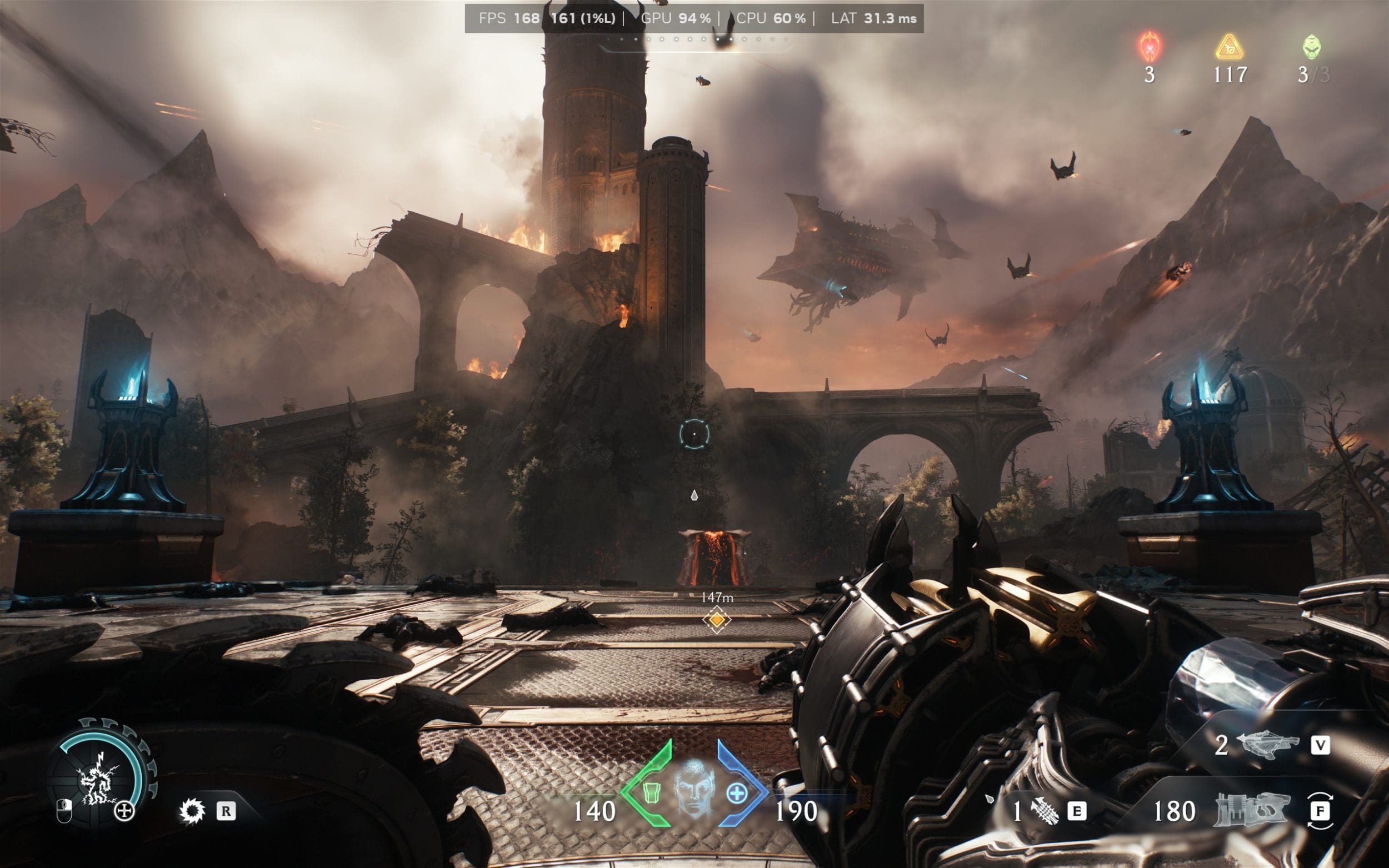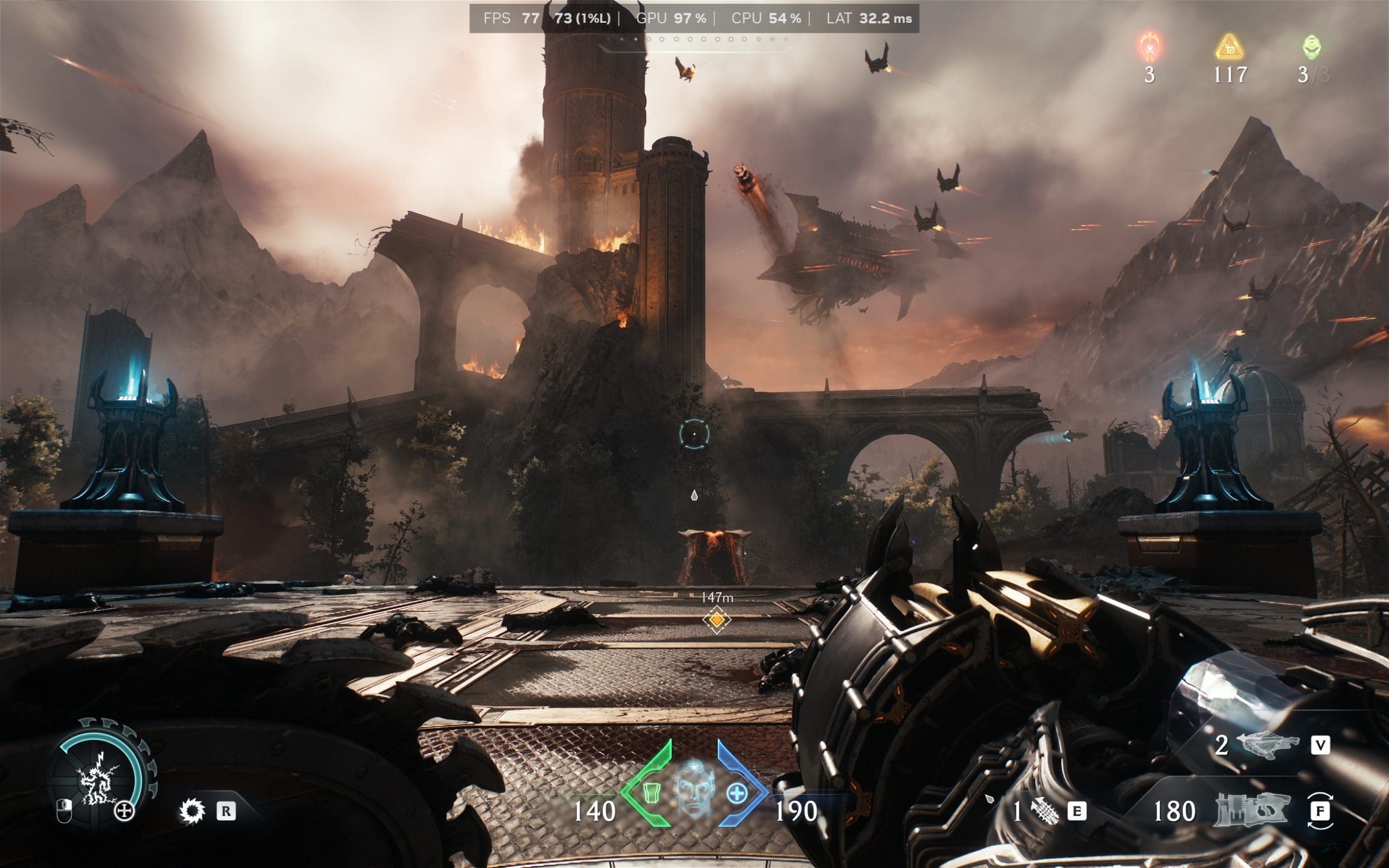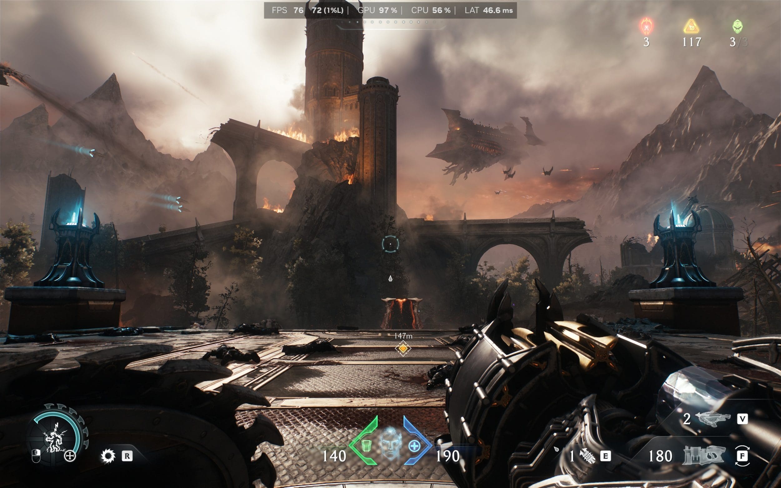 Pentru Doom The Dark Ages am ales nivelul The Siege Part 1, secvența de la început care are loc în prima zonă deschisă a jocului. Aici totul este împins la maximum, iar asta se vede în statisticile de performanță. Folosind doar TAA, fără rezoluție dinamică, pe profilul de performanță Ultra Nightmare, Doom The Dark Ages oferă o perfromanță respectabilă de 76 FPS cu o latență de 46,6 ms pentru întregul sistem. Asta înseamnă că de la momentul procesării unui frame pe GPU, acesta este afișat în 46,6 milisecunde pe ecran. Cu cât latența este mai mică, cu atât fiecare apăsare de buton este înregistrată mai repede de joc, asigurând o experiență de joc cât mai fluidă.