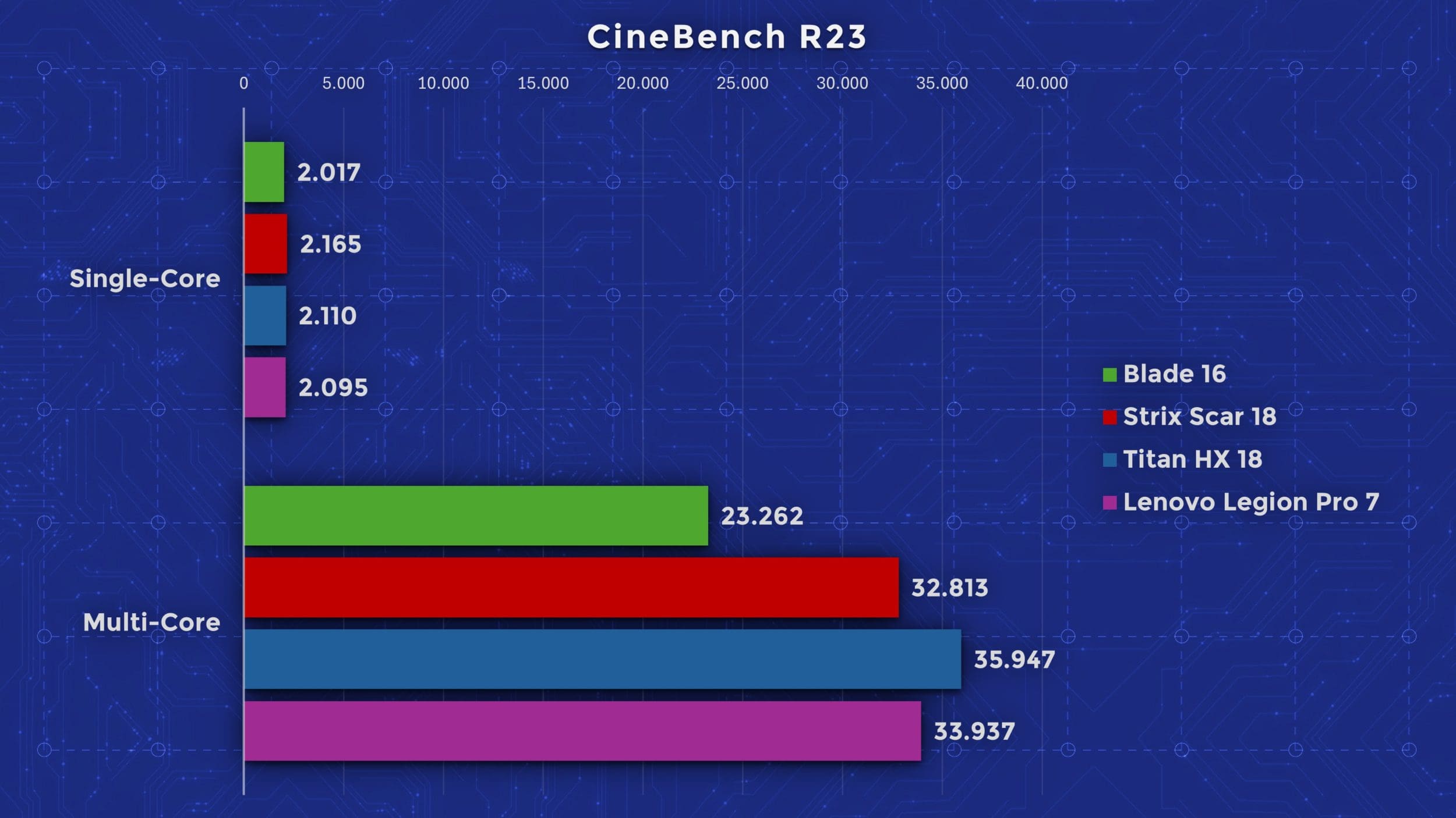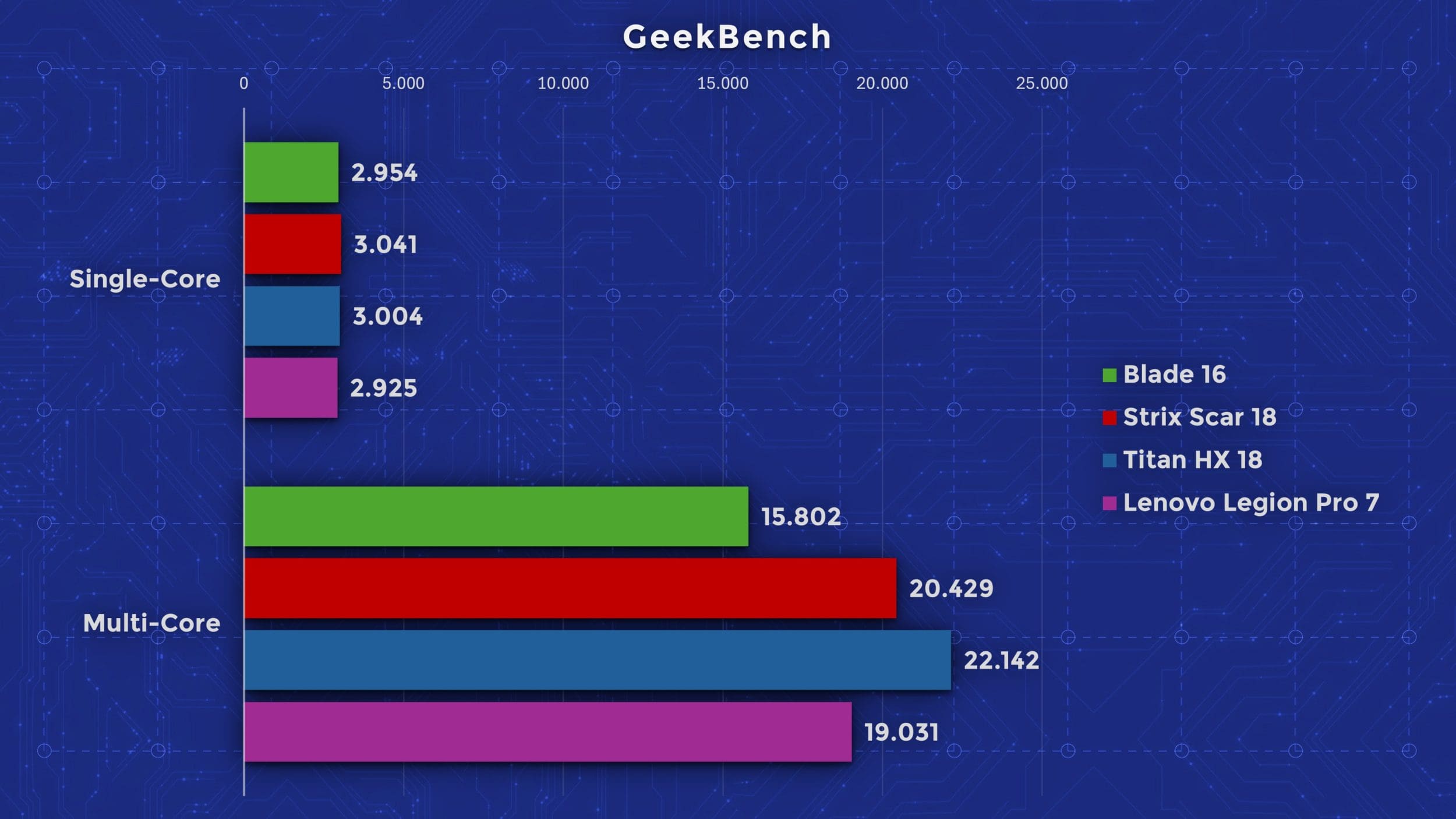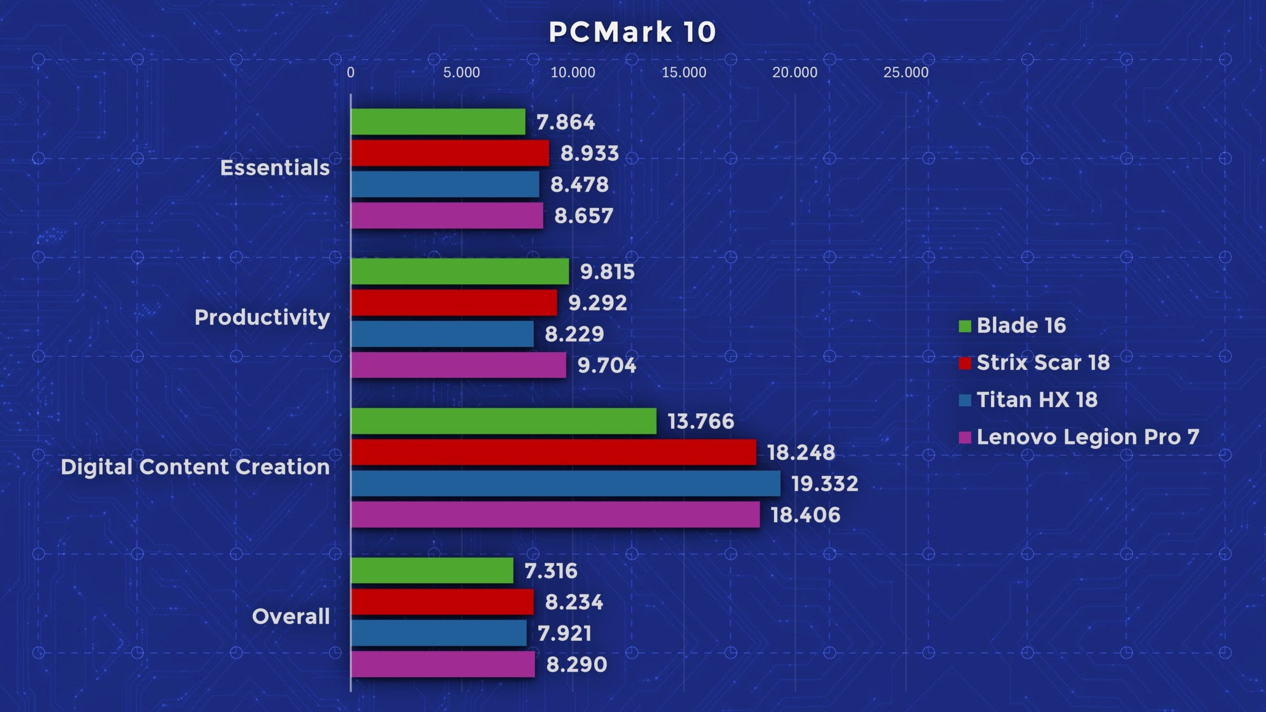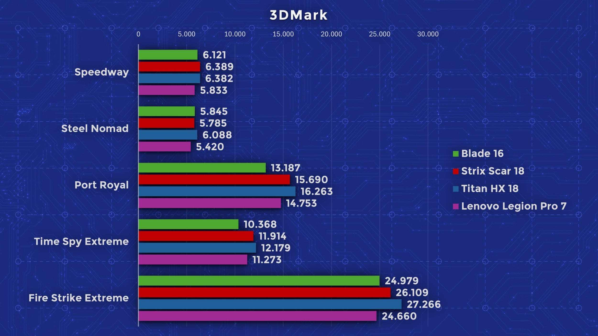 Testele de performanță de productivitate arată că procesorul Intel Core 9 Ultra se comportă la fel de bine precum pe alte modele, dar SSD-ul Samsung este ceva ce nu am văzut până acum. Fără să fie vorba despre un sistem cu SSD-uri în RAID0, avem de a face cu viteze de transfer de până la 13 GB/s. Probabil că nu vom avea nevoie în gaming de astfel de viteze prea curând, dar astfel de valori vor ajuta cu siguranță în productivitate și AI. Desigur, pentru sarcini AI recomand în continuare un model cu RTX 5090 Laptop. Nu doar că are nuclee Tensor mai multe și mai performante, dar are și 8 GB în plus de memorie, ceva extrem de important în acest domeniu.