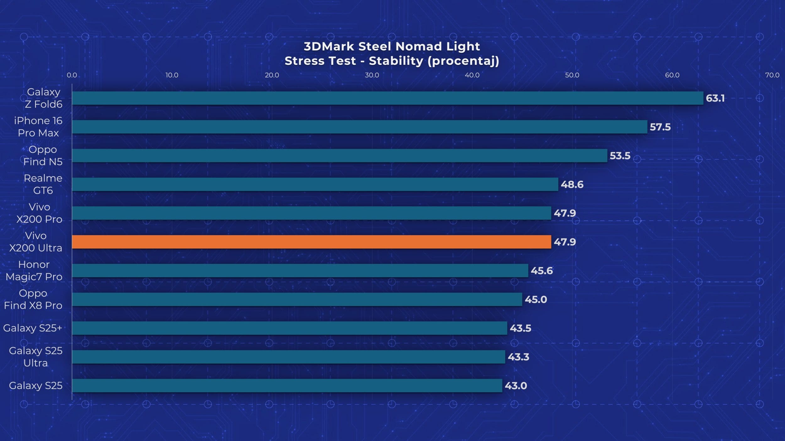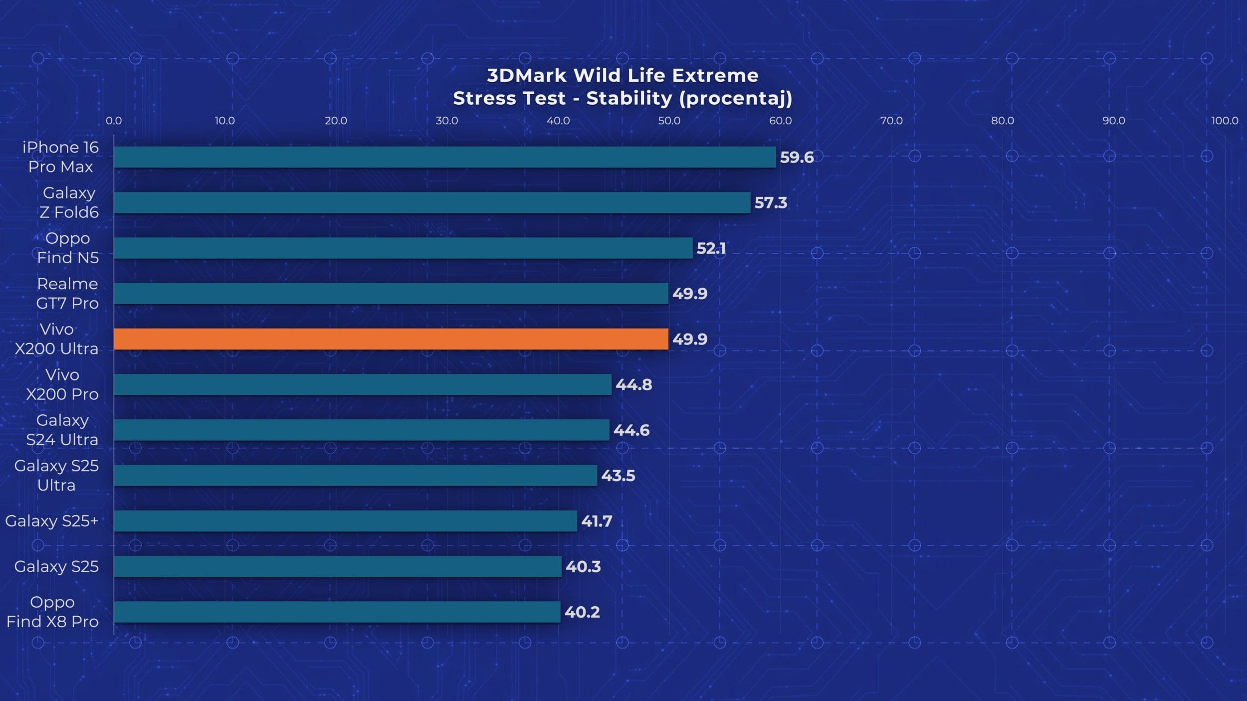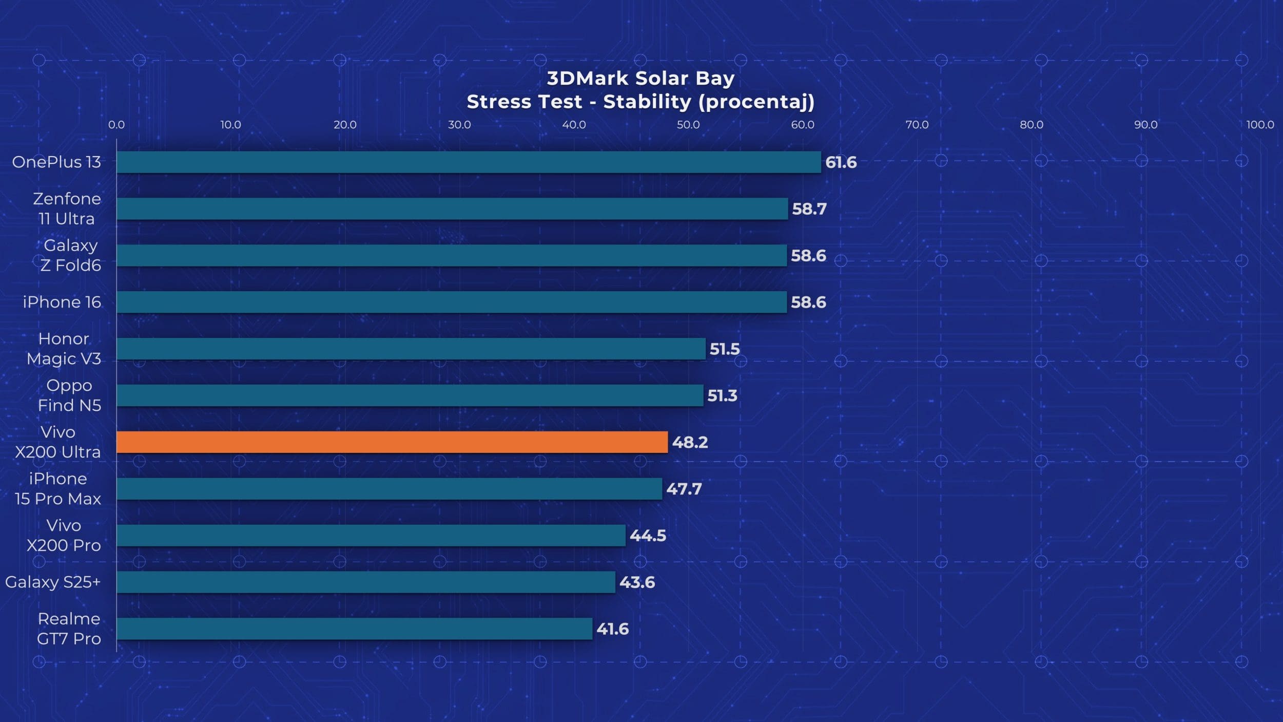 Un alt upgrade pe care X200 Ultra îl primește față de modelul Pro este la nivelul procesorului. Vivo a folosit Dimensity 9400 în toamnă, iar acum adoptă Snapdragon 8 Elite. Cam știm la ce să ne așteptăm de la acest cip, întrucât l-am tot testat în diverse implementări. Performanța este de top, vivo X200 Ultra urcând chiar pe locul întâi în anumite clasamente, dar fiind un camera phone, răcirea nu face față prea bine. În testele de stres scade cam la 50%. E ok, ne interesează performanța foto, nu gaming-ul.