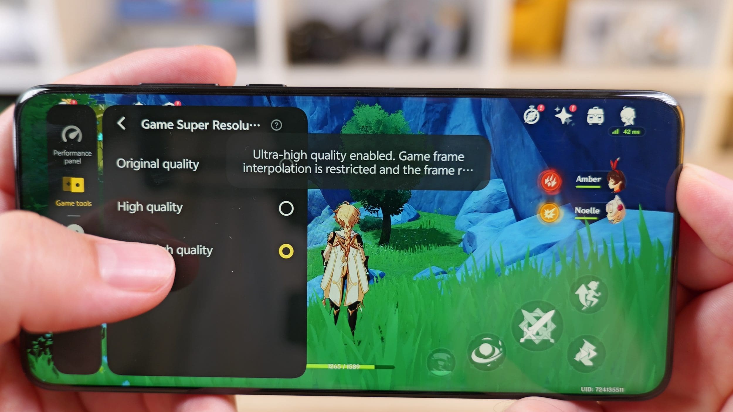Dar pentru că sunt gamer, nu ma pot abține să nu testez și câteva jocuri. Deși există un meniu pentru gaming, nu am găsit o metodă simplă de a afișa framerate-ul în timpul jocului. Există însă un mod de upscaling foarte bun, care chiar îmbunătățește calitatea graficii de pe ecran, un soi de antialiasing cu ceva sharpness extra. E OK, l-aș lăsa pornit. În rest, așa cum era de așteptat pe un telefon cu Snapdragon 8 Elite, totul funcționează bine, hardware-ul fiind mai mult decât capabil să țină Genshin Impact, Call of Duty sau Asphalt.