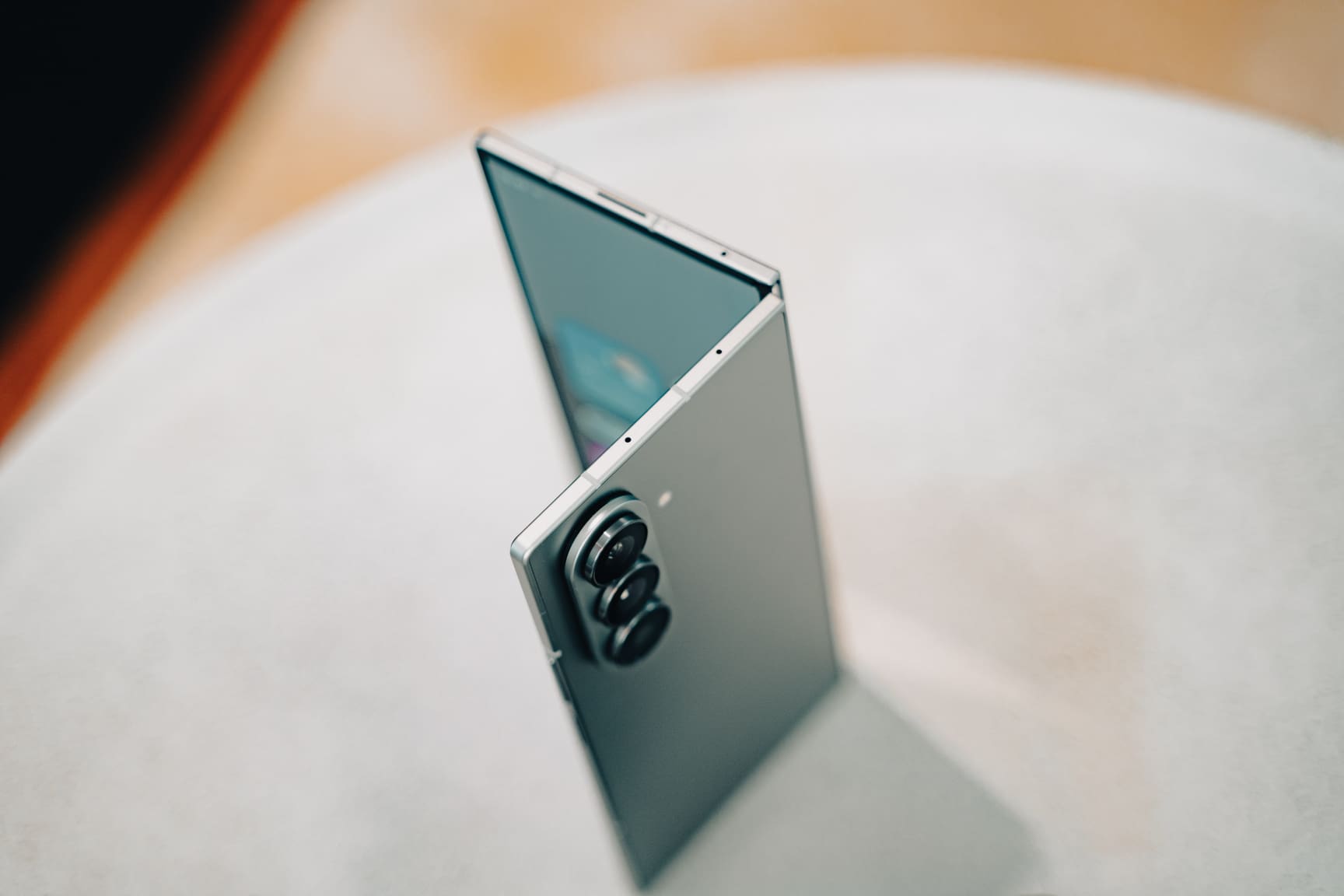 Și construcția ar trebui să fie mai rezistentă decât în trecut, deși atunci când îl manevrezi, la cât de subțire este, pare fragil. Ecranul exterior vine echipat cu Gorilla Glass Ceramic 2, pe margini avem Armor Aluminum și pe spate Gorilla Glass Victus 2. Totul este completat de o nouă balama Armor FlexHinge, extrem de subțire, care este construită să reziste mai bine la utilizarea de zi cu zi dar și să reducă mai mult cuta de pe mijlocul ecranului pliabil.