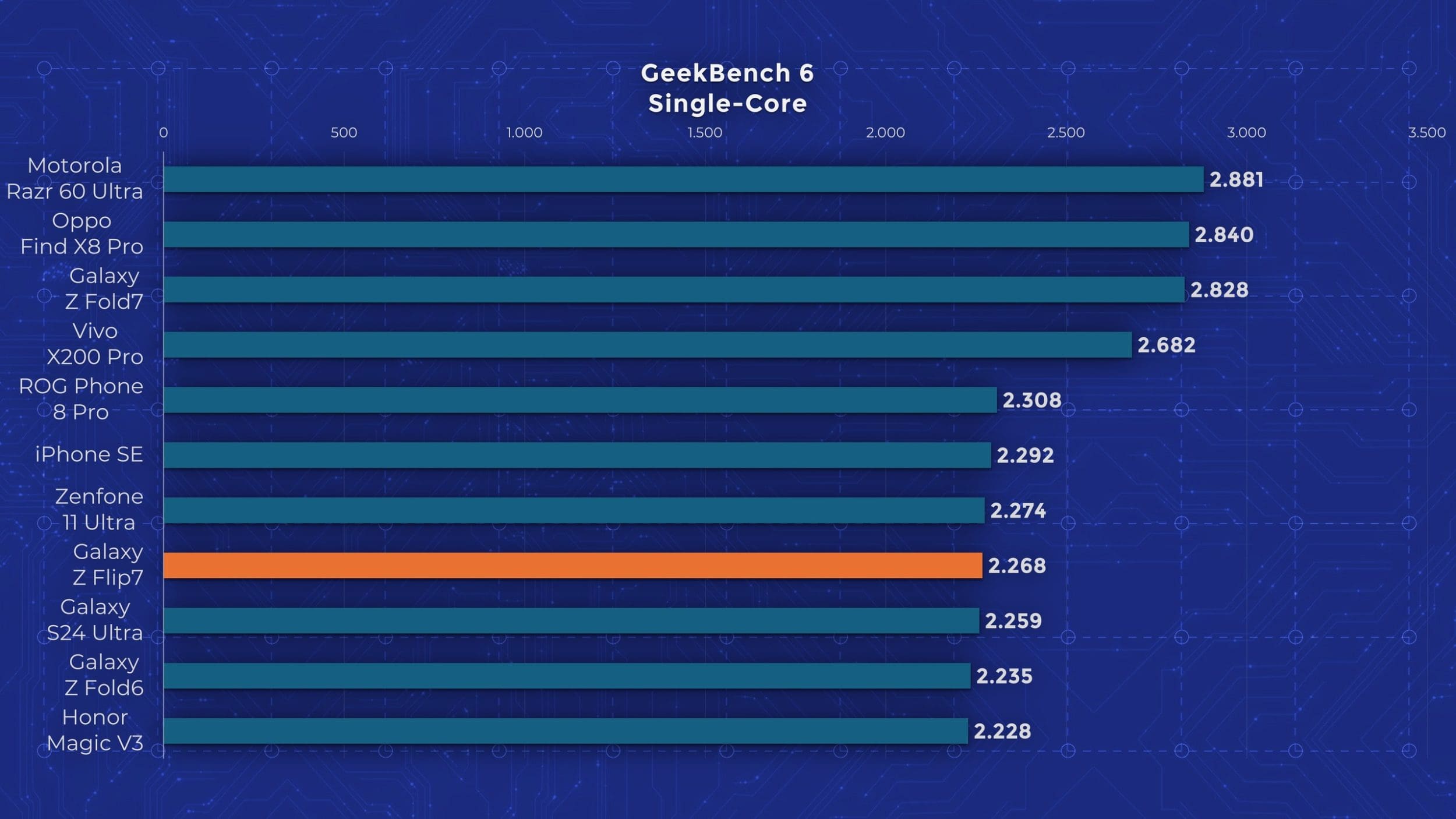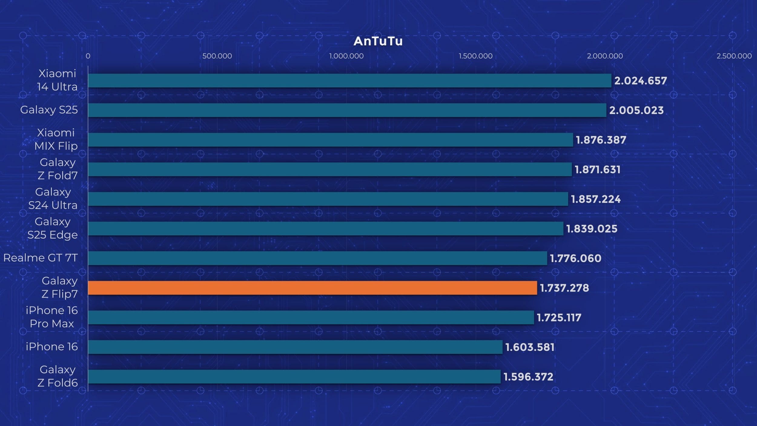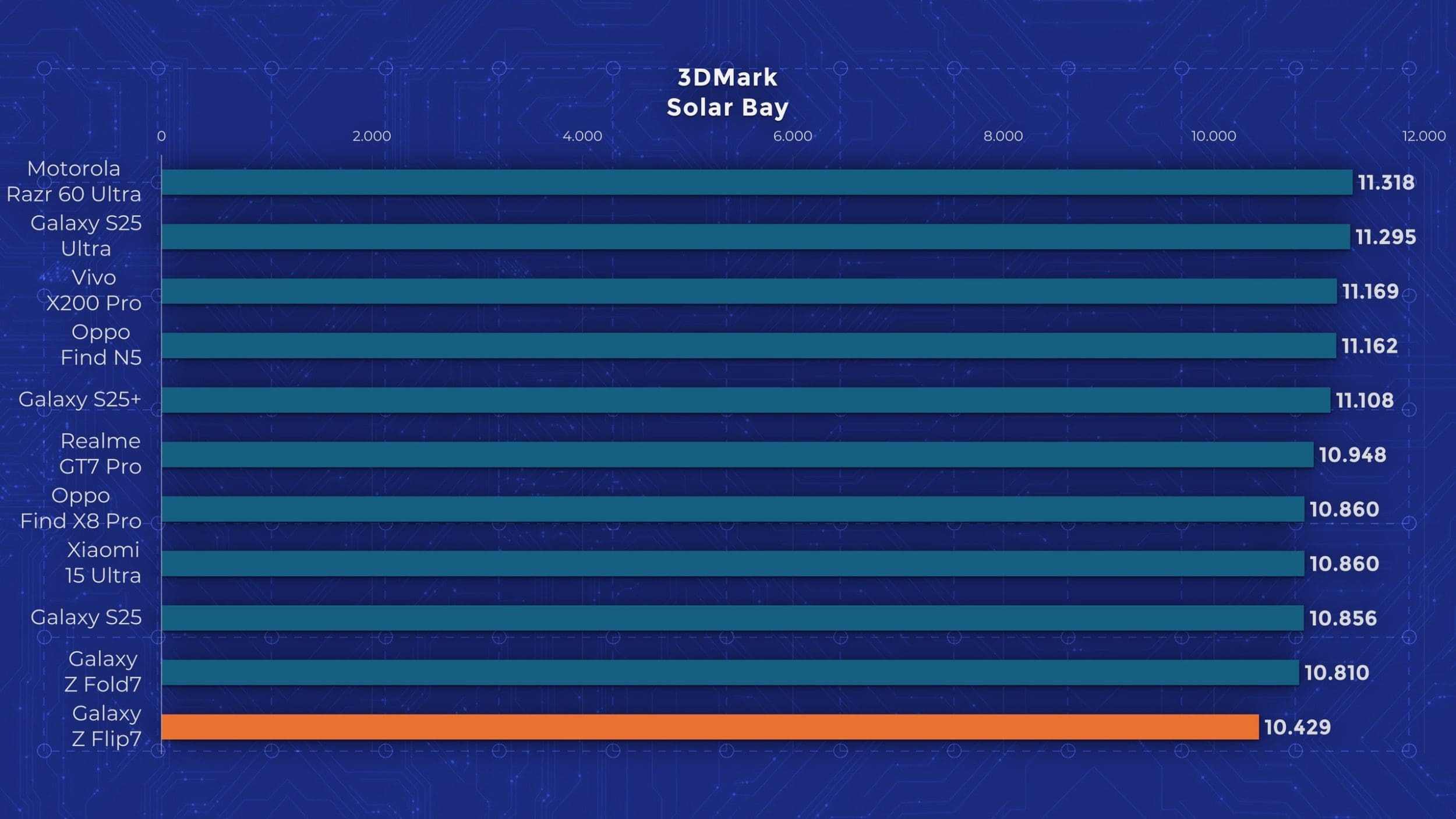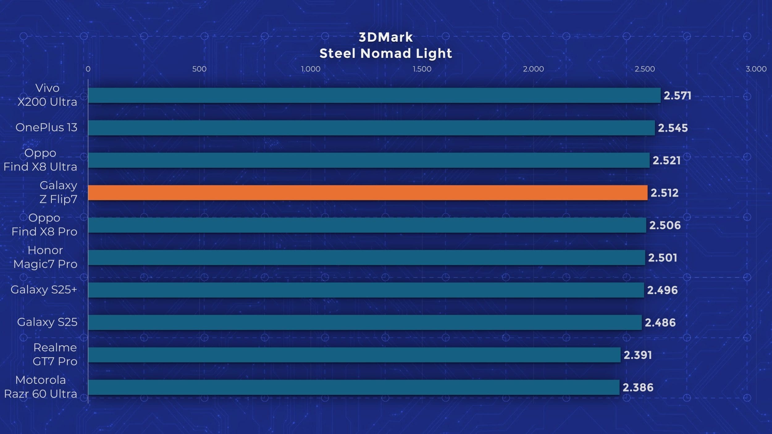 Indiferent ce hardware era folosit pe modelele din seria Galaxy S, pliabilele Galaxy Z au folosit întotdeauna chipset-uri Snapdragon de la Qualcomm. Odată cu trecerea la Flip7, vedem o delimitare clară între Fold și Flip. Dacă Fold rămâne pe Snapdragon 8 Elite, la fel ca modelele S25, Flip7 este mutat pe procesorul proprietar Exynos 2500. Samsung îl prezintă drept o alternativă comparabilă, dar testele spun o poveste diferită. Sigur, este un chipset foarte performant, având 10 nuclee și un GPU Xclipse 950 dezvoltat folosind tehnologie AMD, dar în teste vedem că este mai degrabă comparabil cu soluții flagship de anul trecut decât de anul acesta.