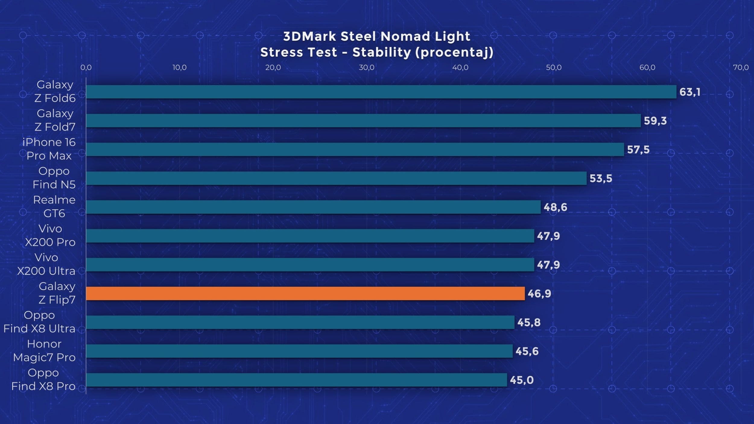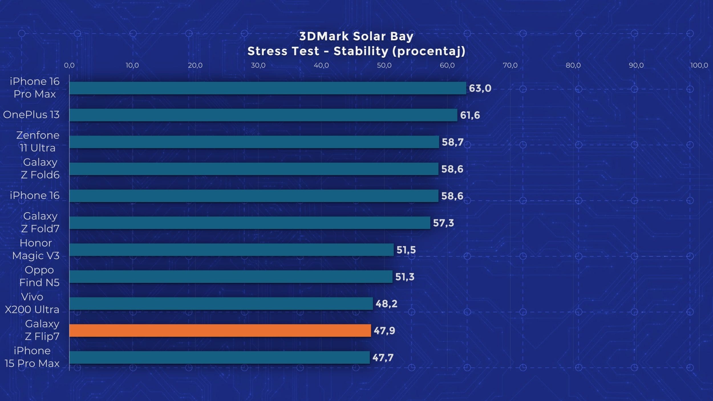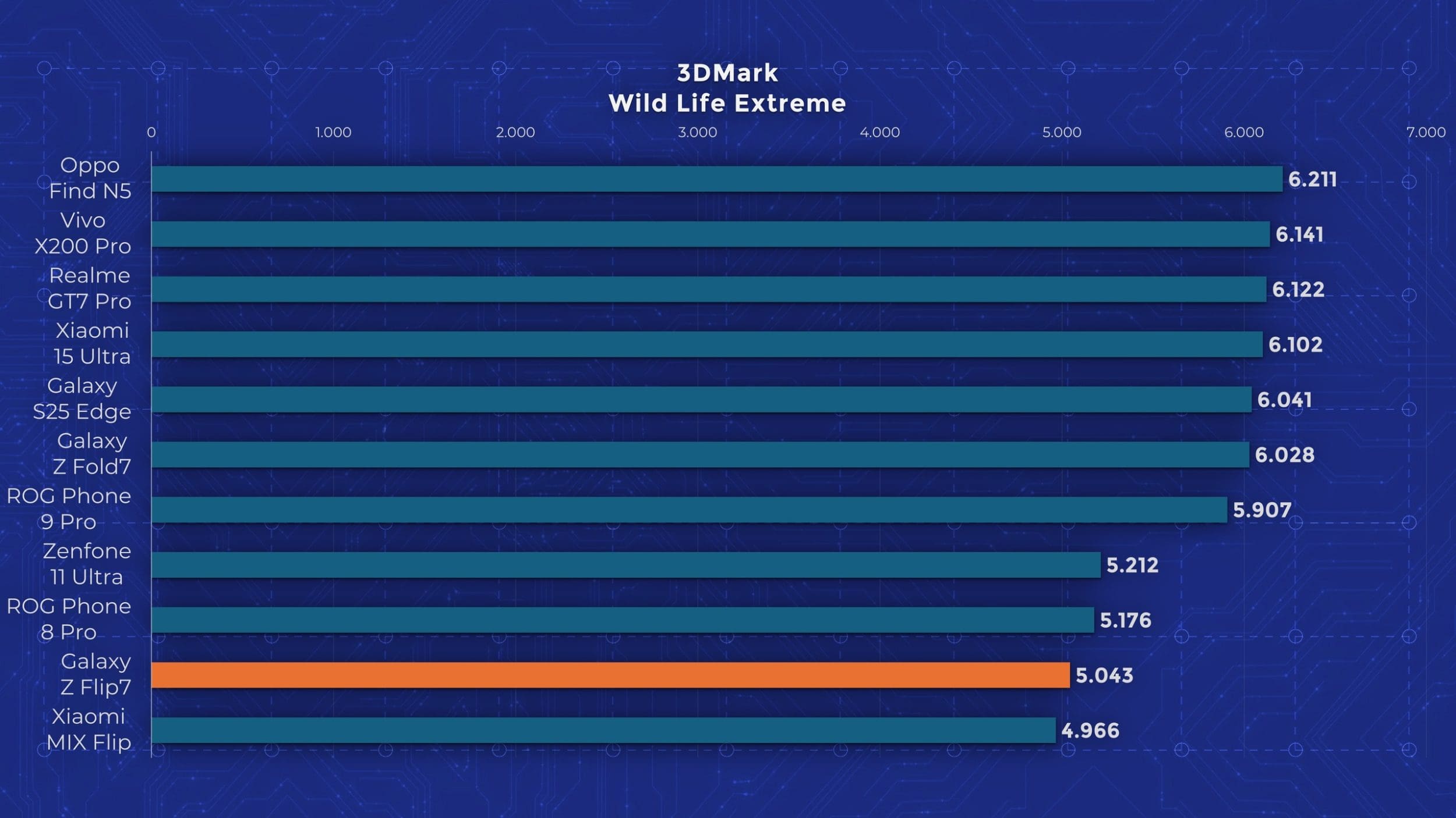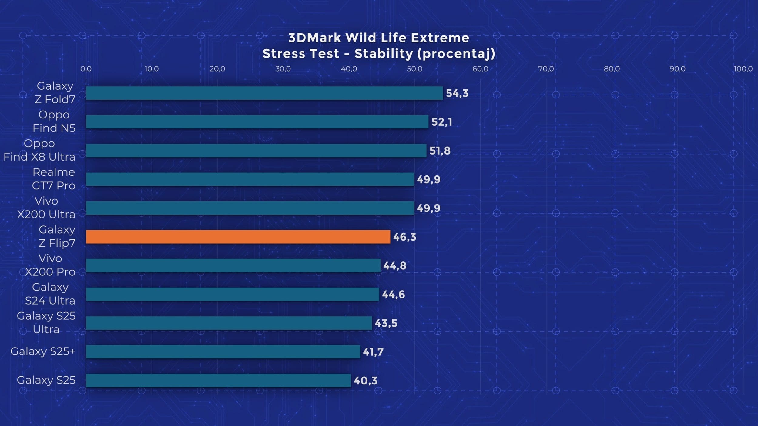 Indiferent ce hardware era folosit pe modelele din seria Galaxy S, pliabilele Galaxy Z au folosit întotdeauna chipset-uri Snapdragon de la Qualcomm. Odată cu trecerea la Flip7, vedem o delimitare clară între Fold și Flip. Dacă Fold rămâne pe Snapdragon 8 Elite, la fel ca modelele S25, Flip7 este mutat pe procesorul proprietar Exynos 2500. Samsung îl prezintă drept o alternativă comparabilă, dar testele spun o poveste diferită. Sigur, este un chipset foarte performant, având 10 nuclee și un GPU Xclipse 950 dezvoltat folosind tehnologie AMD, dar în teste vedem că este mai degrabă comparabil cu soluții flagship de anul trecut decât de anul acesta.