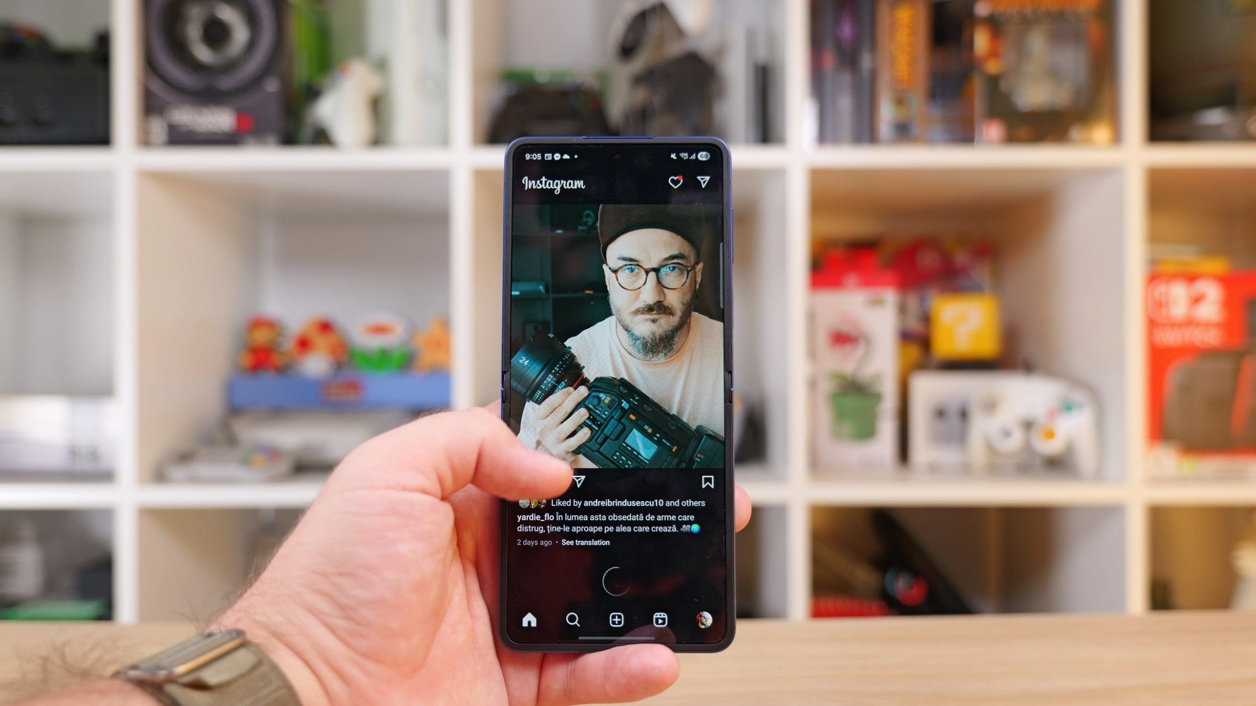 Este clar că plătești pentru tehnologia pliabilă și ecranul în plus mai mult decât pentru camere. Filmarea este și ea bună pe timp de zi, cu stabilizare eficientă, dar am putut observa imediat că sunt mai puține detalii decât în filmările de pe Fold7. Dacă vrei un telefon pentru vlogging însă, acesta este excelent. Te vezi bine pe ecranul exterior pentru încadrare, iar calitatea este foarte bună. Este chiar mai confortabil să te filmezi așa decât pe Fold, ceea ce poate fi un mare avantaj. Flip nu primește însă nici 8K, nici 4K la 120 FPS. Are o cameră pe care te poți baza, și funcții mai simple, dedicate cumva celor care nu se complică cu multe setări avansate.