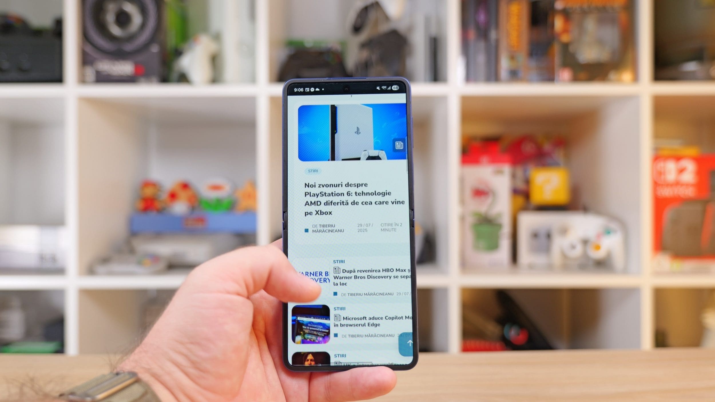 Ecranul interior este la fel de performant precum cel de pe Fold7, și este la rândul său ceva mai rezistent, cu o cută ceva mai subtilă, dar tot cu folie de plastic deasupra. Este bun pentru consum de conținut, pentru rețele de socializare și cam pentru orice altceva. Din acest punct de vedere, Flip7 se simte mult mai apropiat de un telefon tradițional, iar asta este bine, întrucât oferă o experiență familiară, la care te adaptezi mai ușor, decât pe un model Fold.