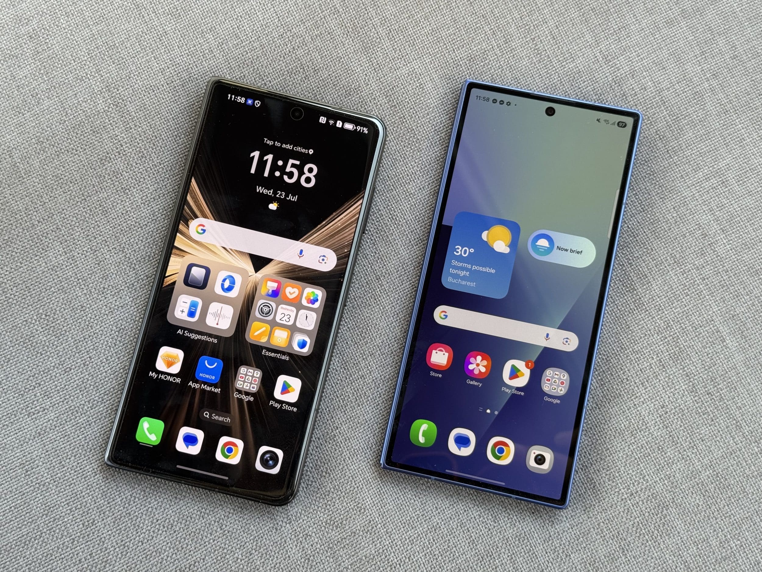 La camere s-ar putea să vedem o altă victorie din partea Honor, întrucât producătorul chinez preferă camere de rezoluție mai înaltă pe întreaga plajă. Sigur, nu are senzor de 200 megapixeli pe camera principală, la fel ca Samsung, dar are un senzor de 1/1.56” de 50 megapixeli, similar cu cee ace vedem pe telefoane precum OnePlus 13. Ultrawide-ul de 50 megapixeli promite o deschidere mare, de 122 grade, iar zoom-ul 3x are senzor de 64 megapixeli, deci poate face liniștit un crop la 6x fără a pierde detalii prea multe. Chiar și camerele selfie sunt acum de 20 megapixeli atât interior, cât și exterior.