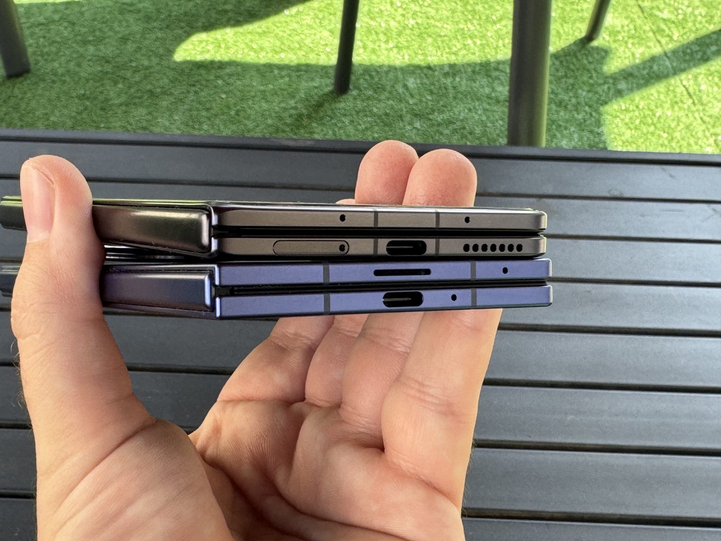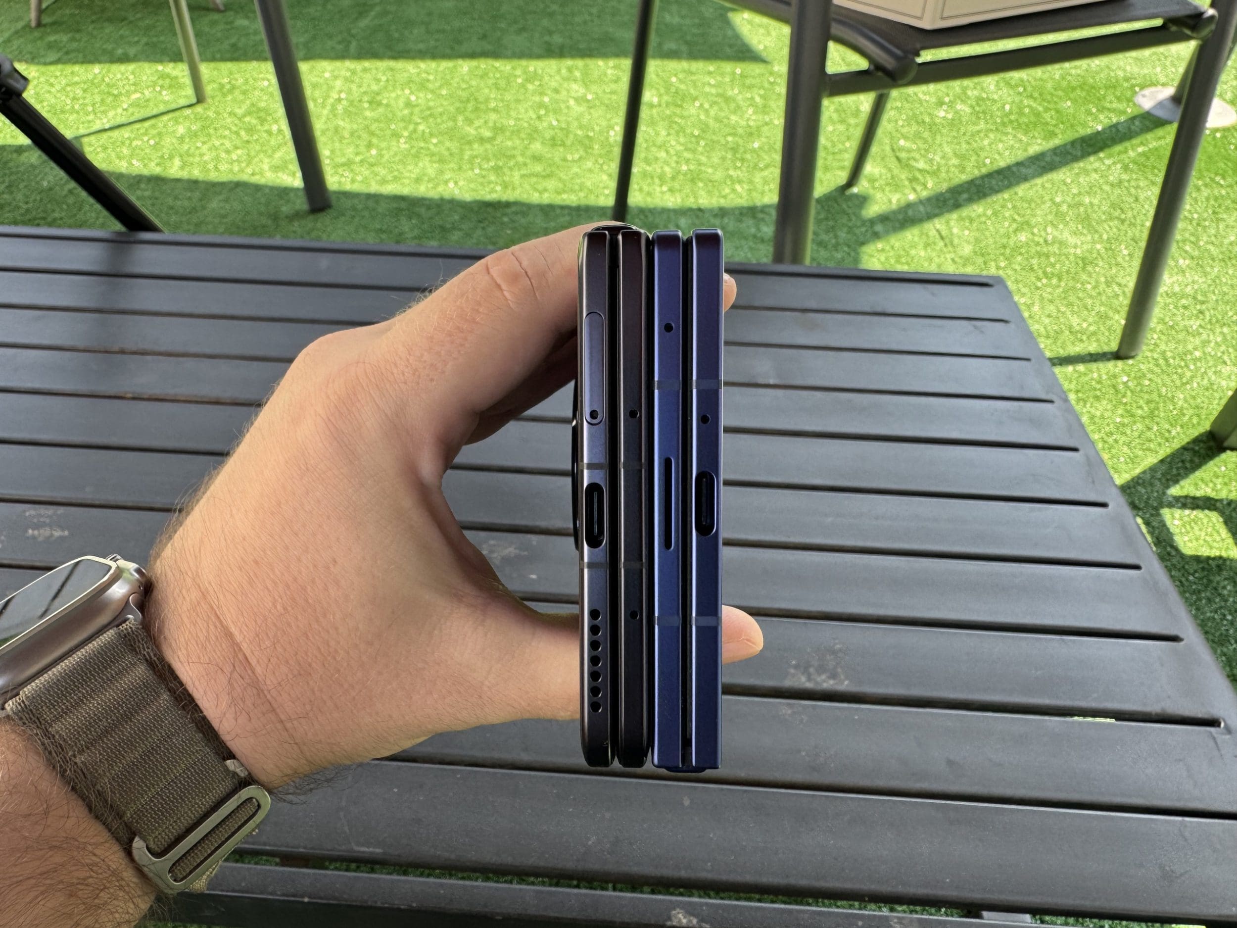 La prima impresie, Honor Magic V5 nu pare extrem de diferit din punct de vedere al design-ului, construcției și dimensiunilor față de V3-ul pe care l-am testat anul trecut. Cele două telefoane par aproape didentice de la depărtare, dar încep să apară particularități imediat ce te uiți mai atent. Avem acum un modul de cameră mai mare, o balama cu alt design și un design puuuuțin mai subțire. Nu este o diferență atât de mare, iar atunci când Honor lăuda Magic V5 că este mai subțire decât Fold7, vorbea despre o singură variantă: cea realizată din ceea ce numește „aerospace fiber”. Aceea într-adevăr are 8,8mm pliat și doar 4,1mm deschis, dar restul culorilor au 4,2mm, respectiv 9mm, deci sunt mai groase decât Fold7.