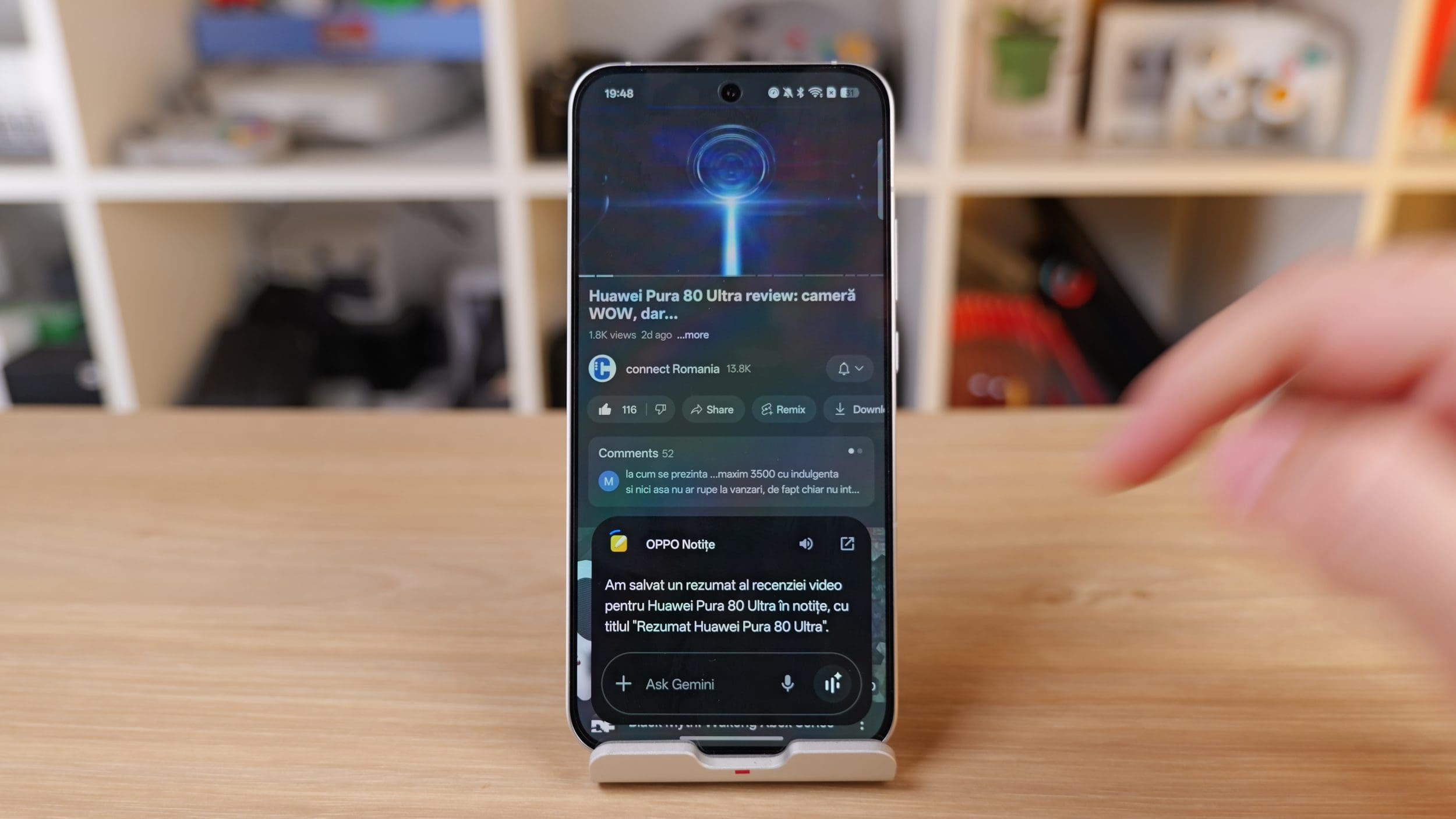 Apoi, Oppo face ceva ce nu prea am văzut nicăieri: oferă integrare cu Gemini în aplicațiile sale native. De exemplu, poți să ceri gemini să facă un rezumat al unui clip de pe YouTube și să îl salveze în notițe. Și o va face. Iar, rezumatul va fi în română, dacă îi ceri asta în română. Funcționează destul de bine. Folosind funcțiile rapide din sidebar poți să faci rezumate și la articole de pe internet, pe care le poți salva tot în notițe, iar aplicația de ceas de la Oppo poate, la rândul ei să fie controlată de Gemini, astfel putând seta alarme doar prin control vocal.
